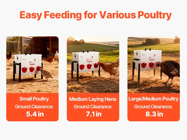 • Three Height Adjustable: The automatic poultry feeder supports three height adjustments (5.4 in/7.1 in/8.3 in) to suit from small to medium-large poultry. It adapts as your flock grows, ensuring long-term use without additional purchases, saving costs