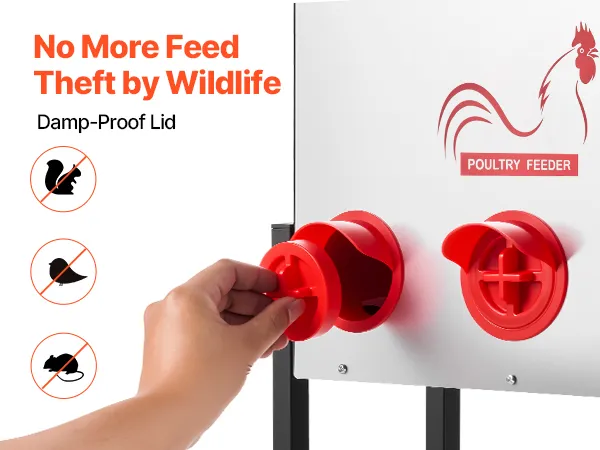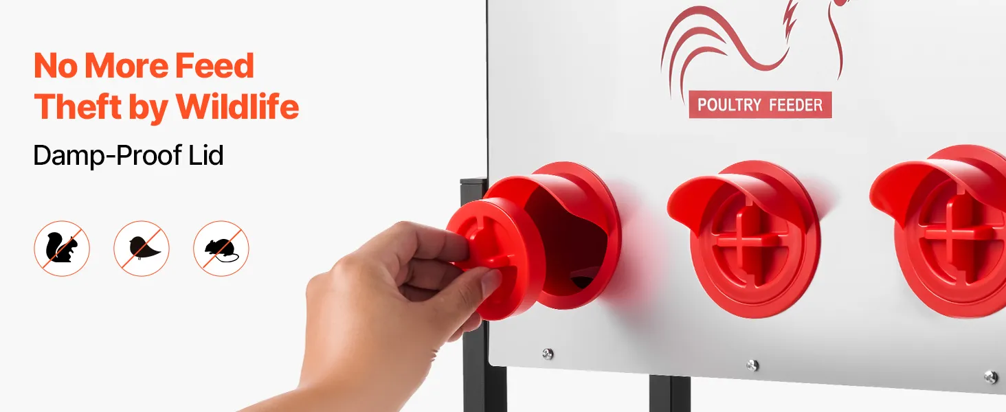 • Fresh & Clean Feed: The chicken feeder features a full-cover, lockable, and waterproof lid, feeding ports with sealing rings, plus an extended design to block dampness. Adding a damp-proof cover to the ports to keep the feed dry and secure