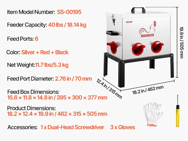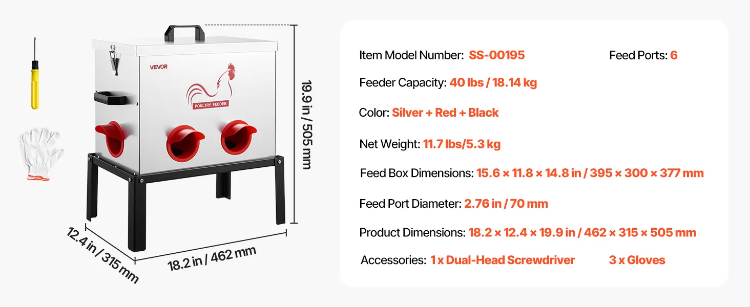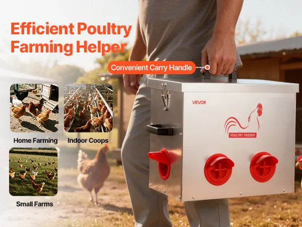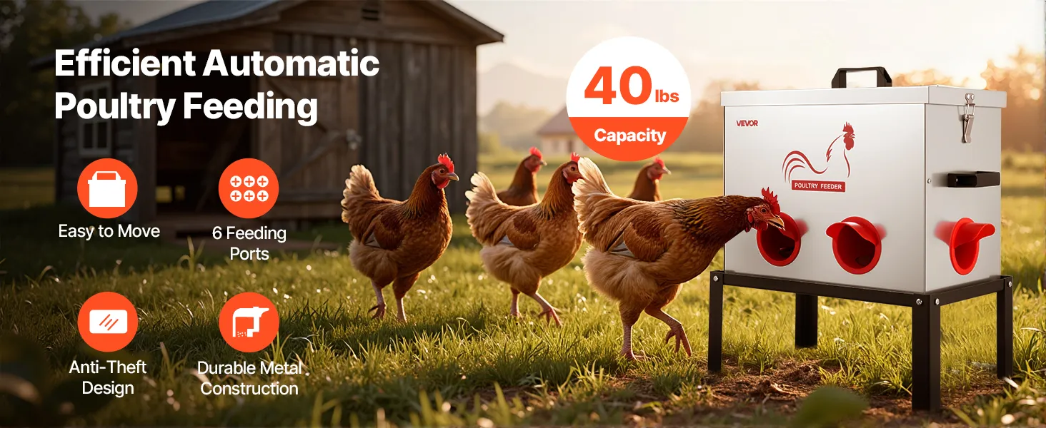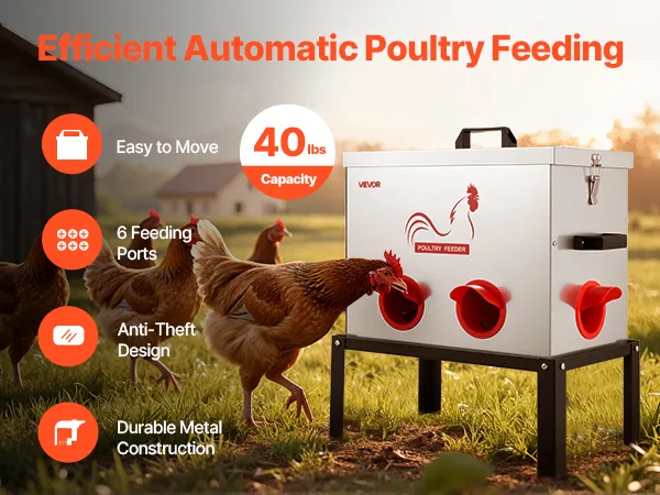 This 40 lbs capacity metal automatic chicken feeder features six feeding ports, allowing multiple poultry to feed simultaneously. With a gravity-fed design, it automatically replenishes feed, saving on feed consumption.