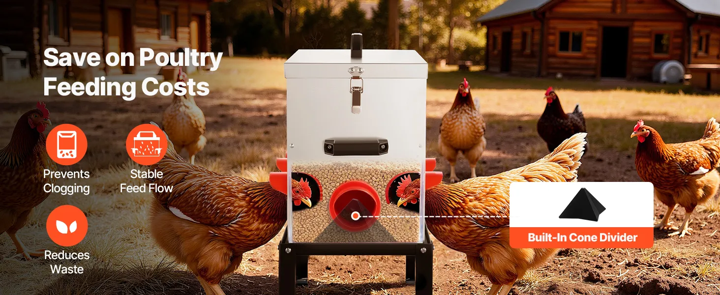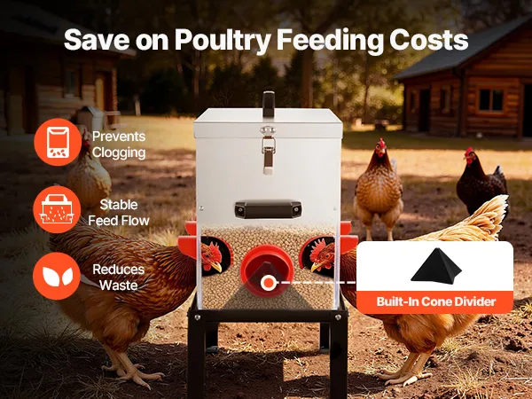 Our automatic poultry feeder adopts anti-waste design with a built-in cone divider, ensuring smooth, consistent feed without clogs. It easily accesses remaining feed, minimizing waste and saving you money on feed.