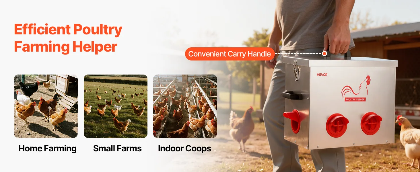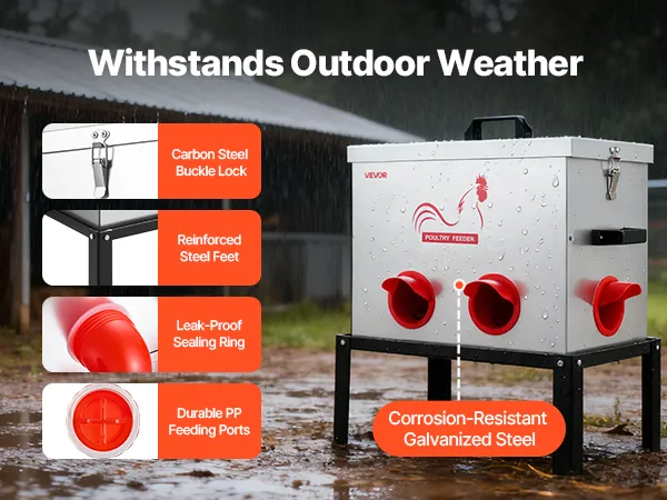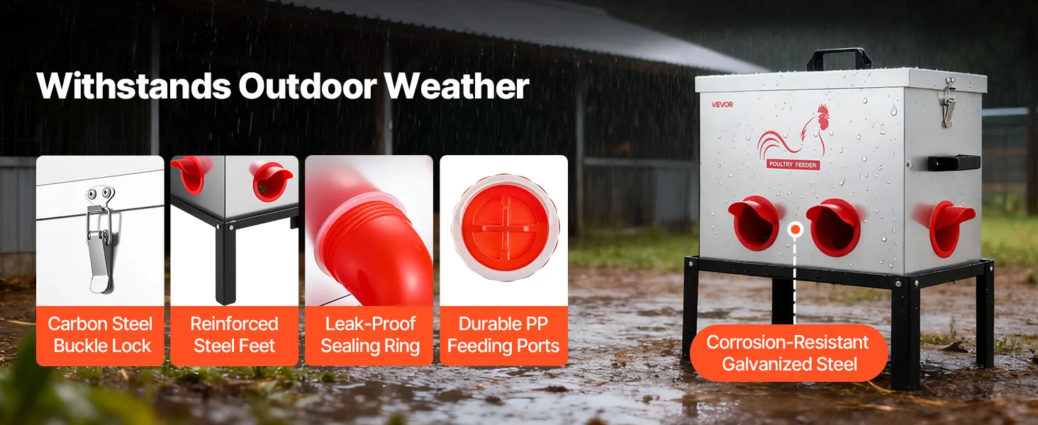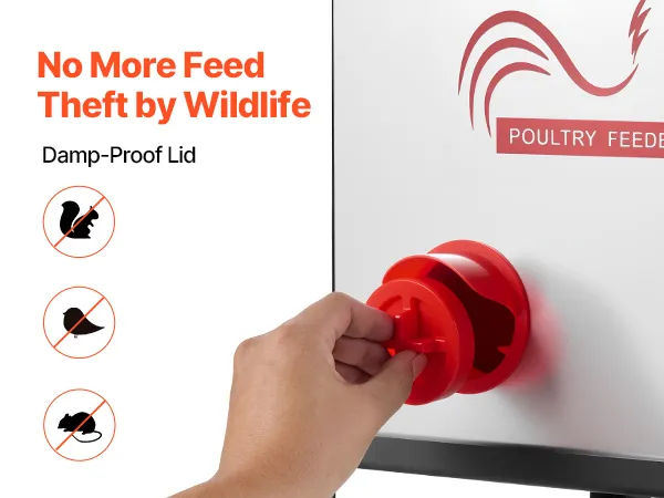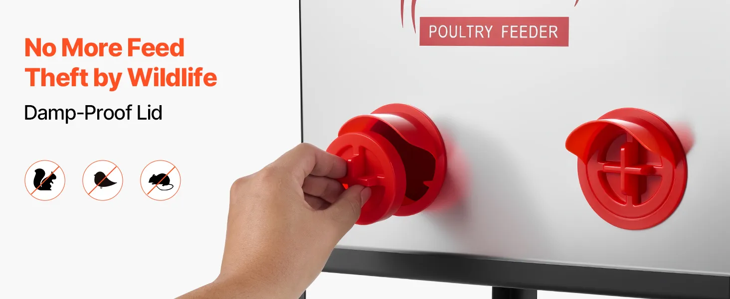 Our chicken feeder comes with feeding ports with damp-proof covers to block squirrels, birds, rodents, and other animals from stealing the feed. It helps reduce feed loss outdoors, ensuring your feed stays secure.