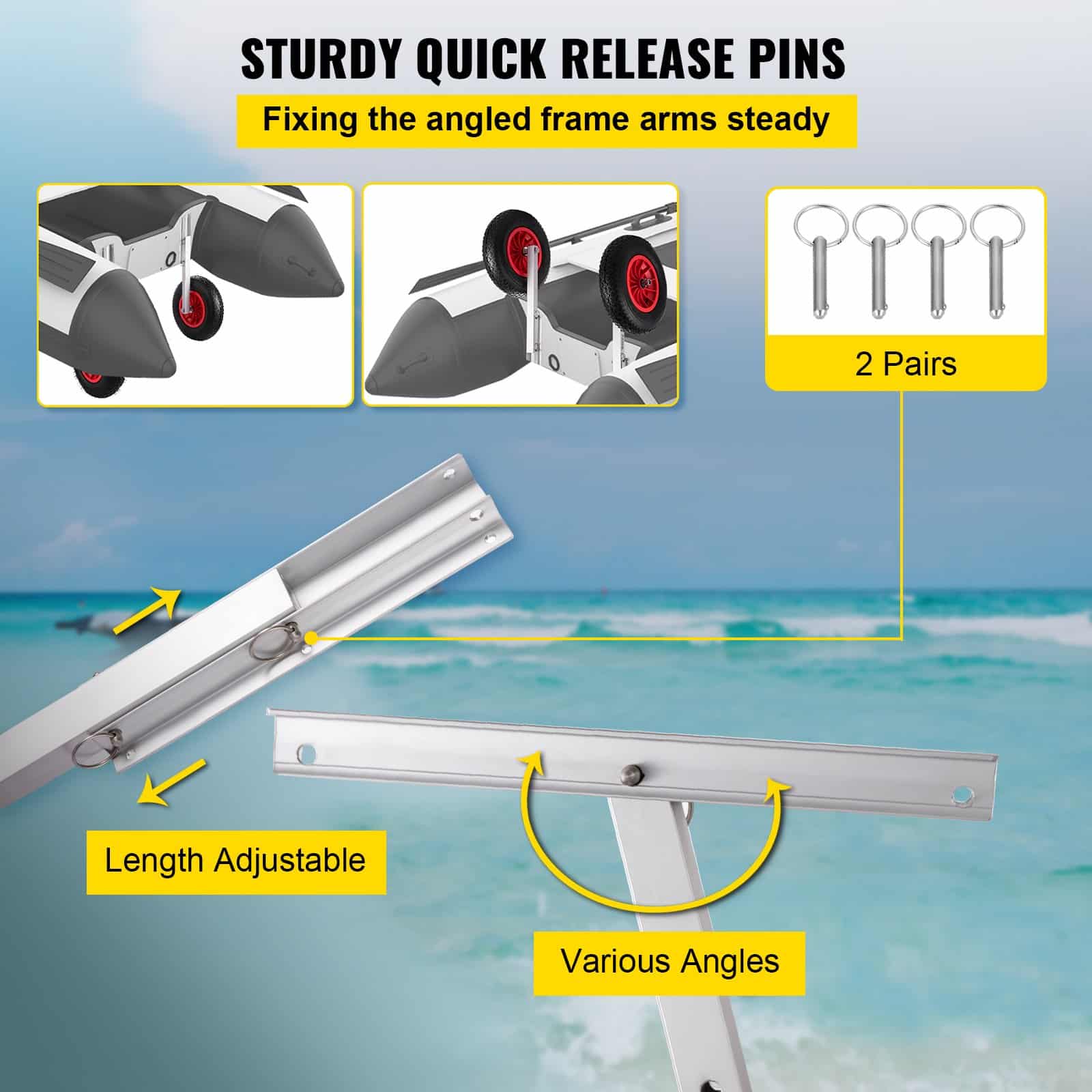 Two pairs of spring lock pins demonstrate the quick operation feature of our transom launching wheels, making frame wheel arms' length and position adjustable.