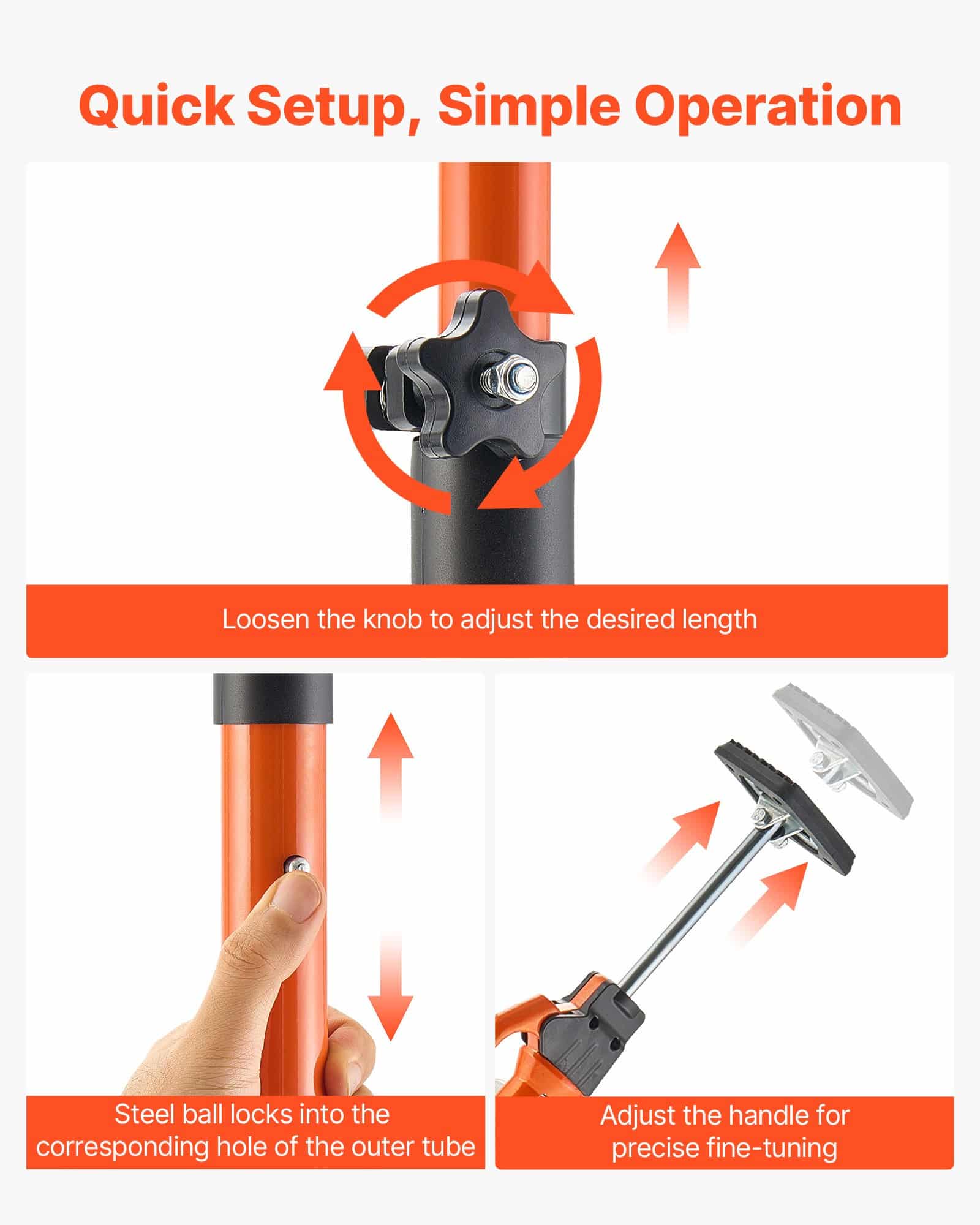 Ergonomic aluminum handle for easy control, quick-release button for fast retraction, and TPR foot pad of the cabinet jack to secure floors. Set up or take down without tools—ideal for one-person jobs.