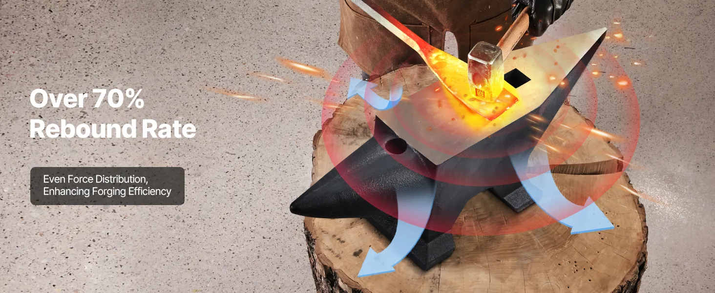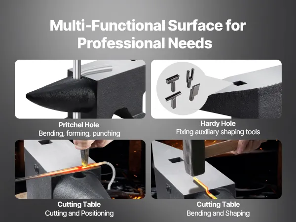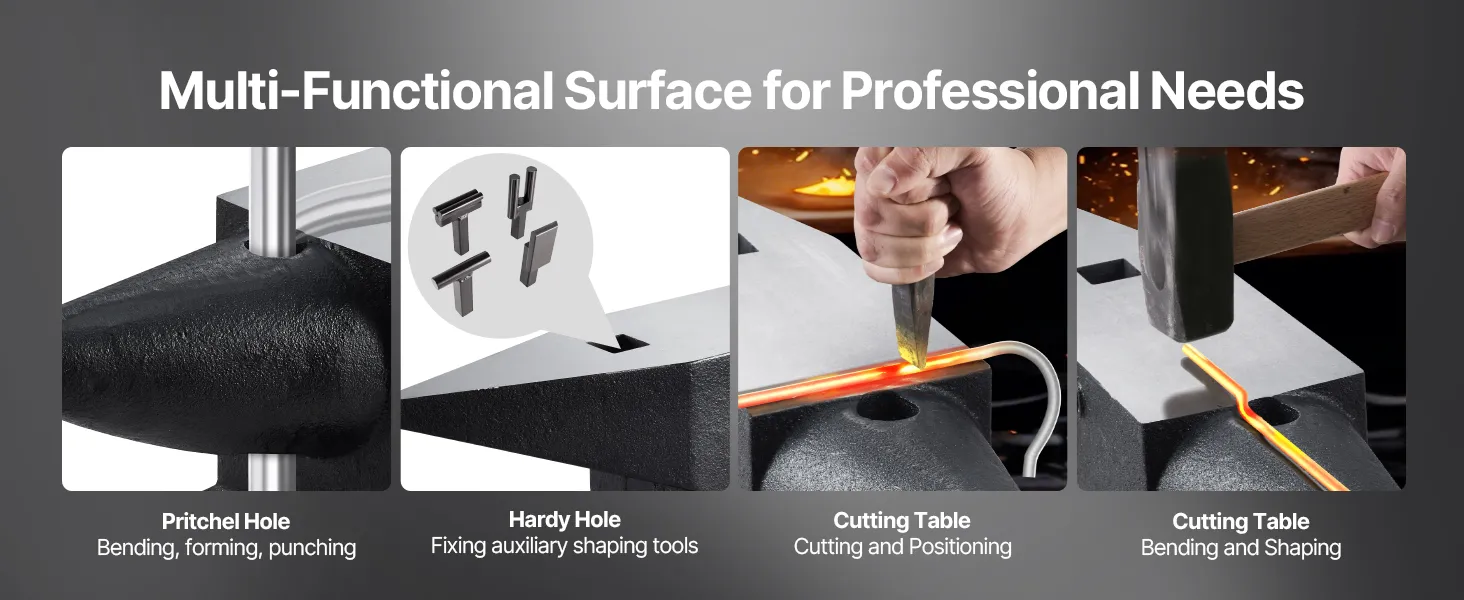 • Holes & Horns for Different Uses: Round horn and the flat horn of the anvil blacksmith are used for smoothing, bending, and shaping. And the hardy hole and pritchel hole can show a good performance in accessories’ punching and twisting.