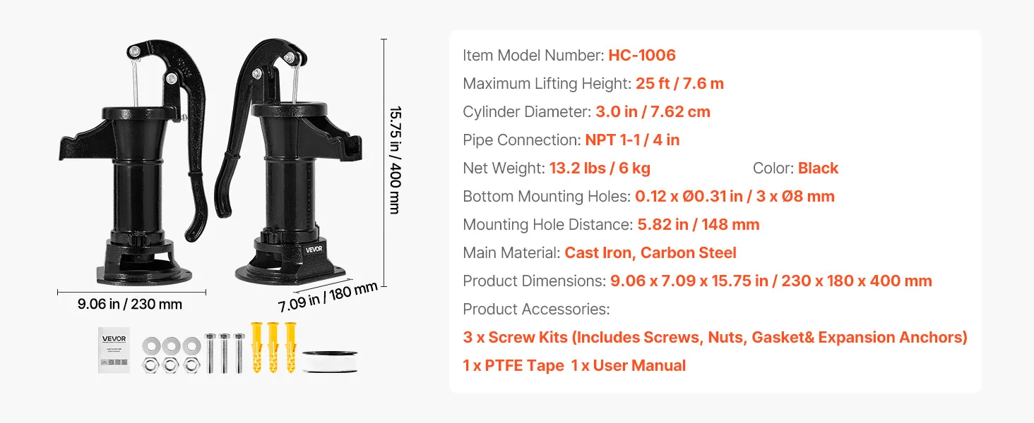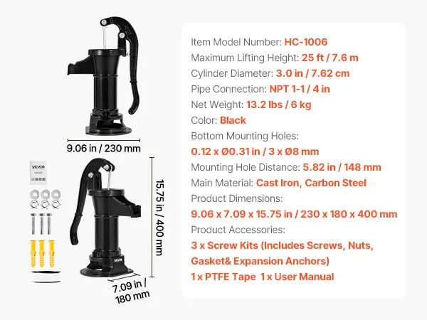 VEVOR Well Hand Pitcher Pump, 25 ft Maximum Lift, Antique Cast Iron Manual Hand Water Pump, NPT 1-1/4 in Connection, Easy Installation, Old Fashioned for Outdoor Garden, Pond, Backyard, Farm, Black