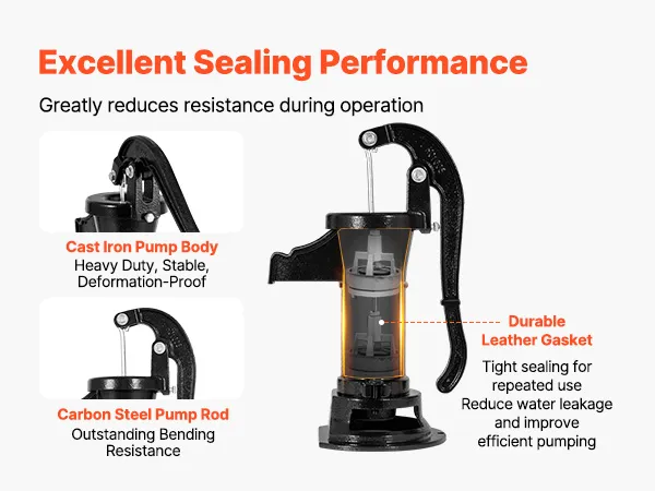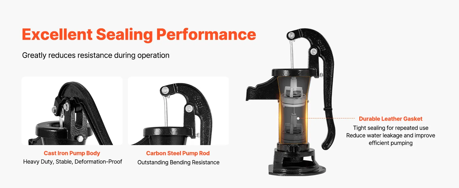 Built with premium materials, this hand water pump cast iron provides stable and durable performance. It resists bending and breaking under frequent use. The reliable sealing reduces air entry, improving water pump efficiency and speed.