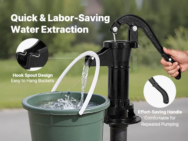 Our pitcher pump adopts a curved handle to fit the palm's natural shape, reducing hand strain even after repeated pumping. A hook spout design allows you to hang buckets securely when filling without hand-holding.