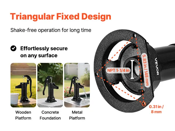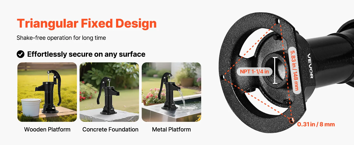 The pitcher pump for well base features a triangular hole design, can be securely mounted to a wide range of flat surfaces using screws. Easy to install and firmly fixed. No wobbling, just steady water pumping every time.