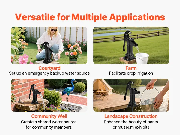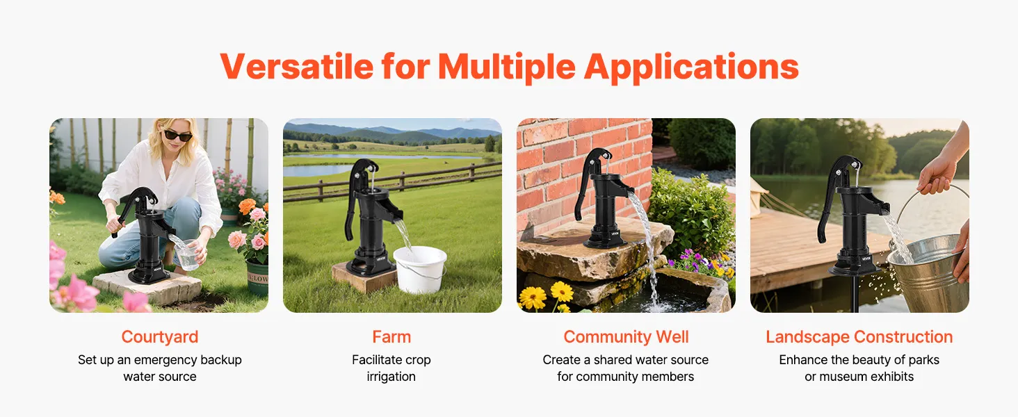 From peaceful home gardens to expansive farmland, this hand water pump delivers reliable water access to meet your needs. Built for flexibility, it ensures you can pump water anytime, anywhere with diverse applications.