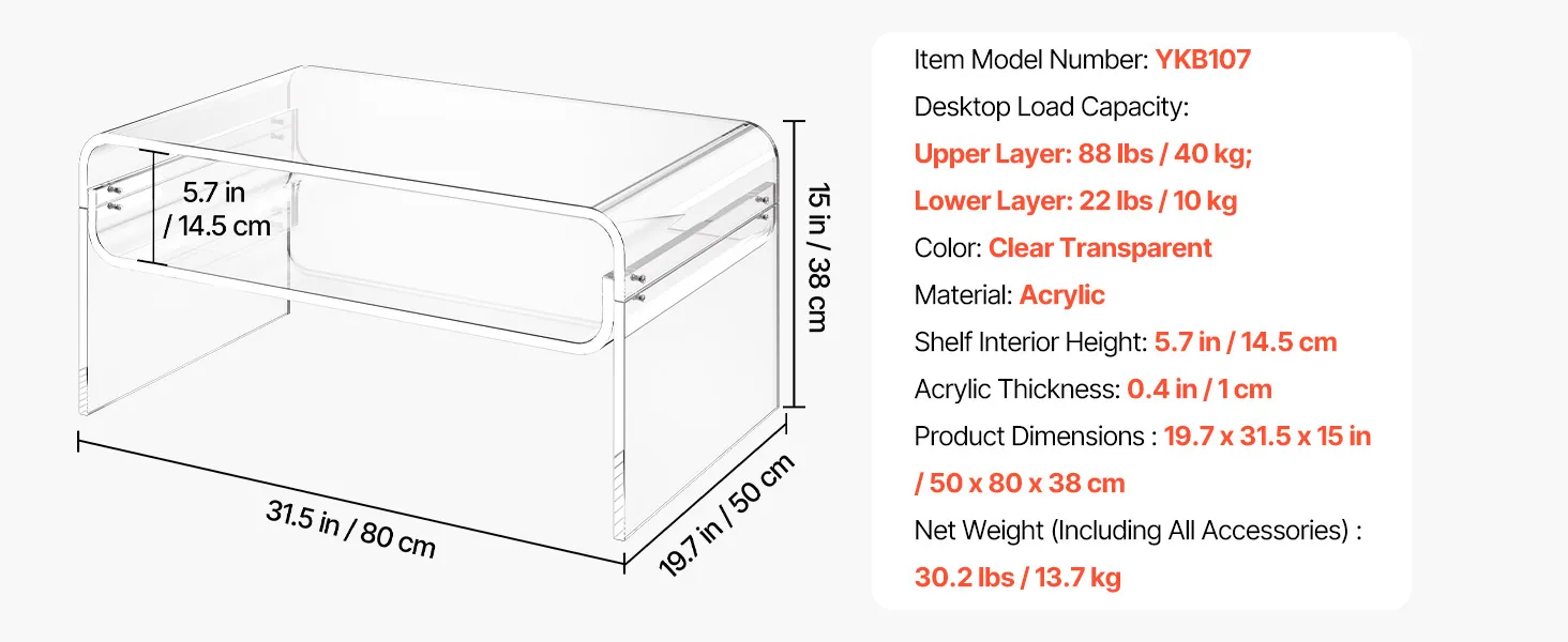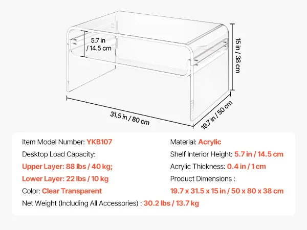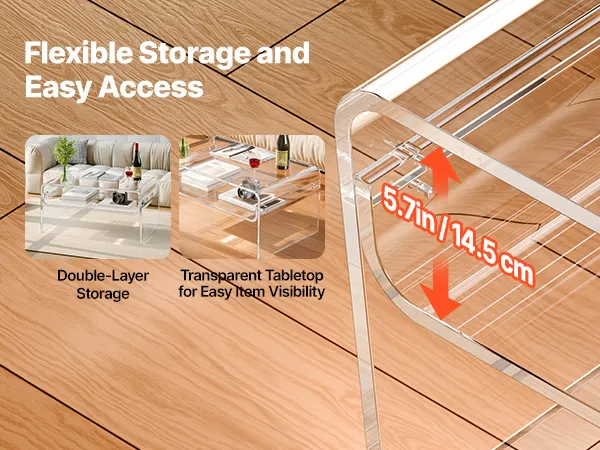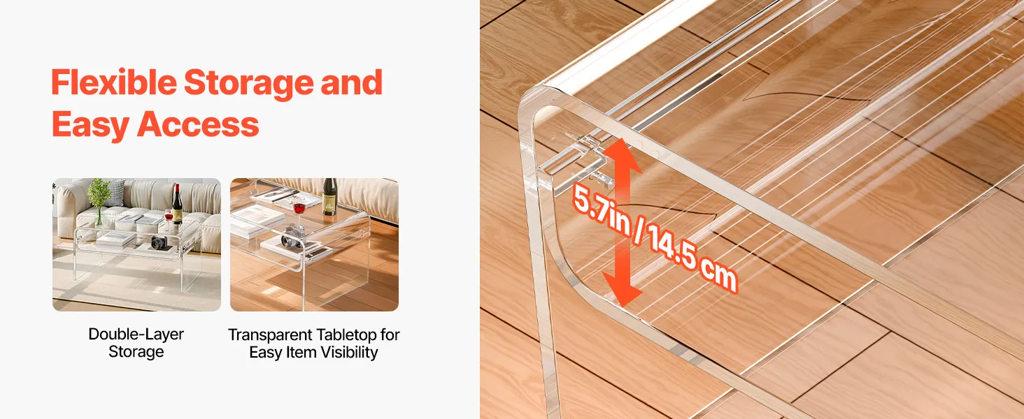 VEVOR Acrylic Coffee Table, 2 Tiers Center Table with Storage Shelf, Modern Rectangle Acrylic Coffee Desk, Ideal for Dining Room, Kitchen Island, Restaurant, Office, 50 x 80 x 38 cm (Clear)