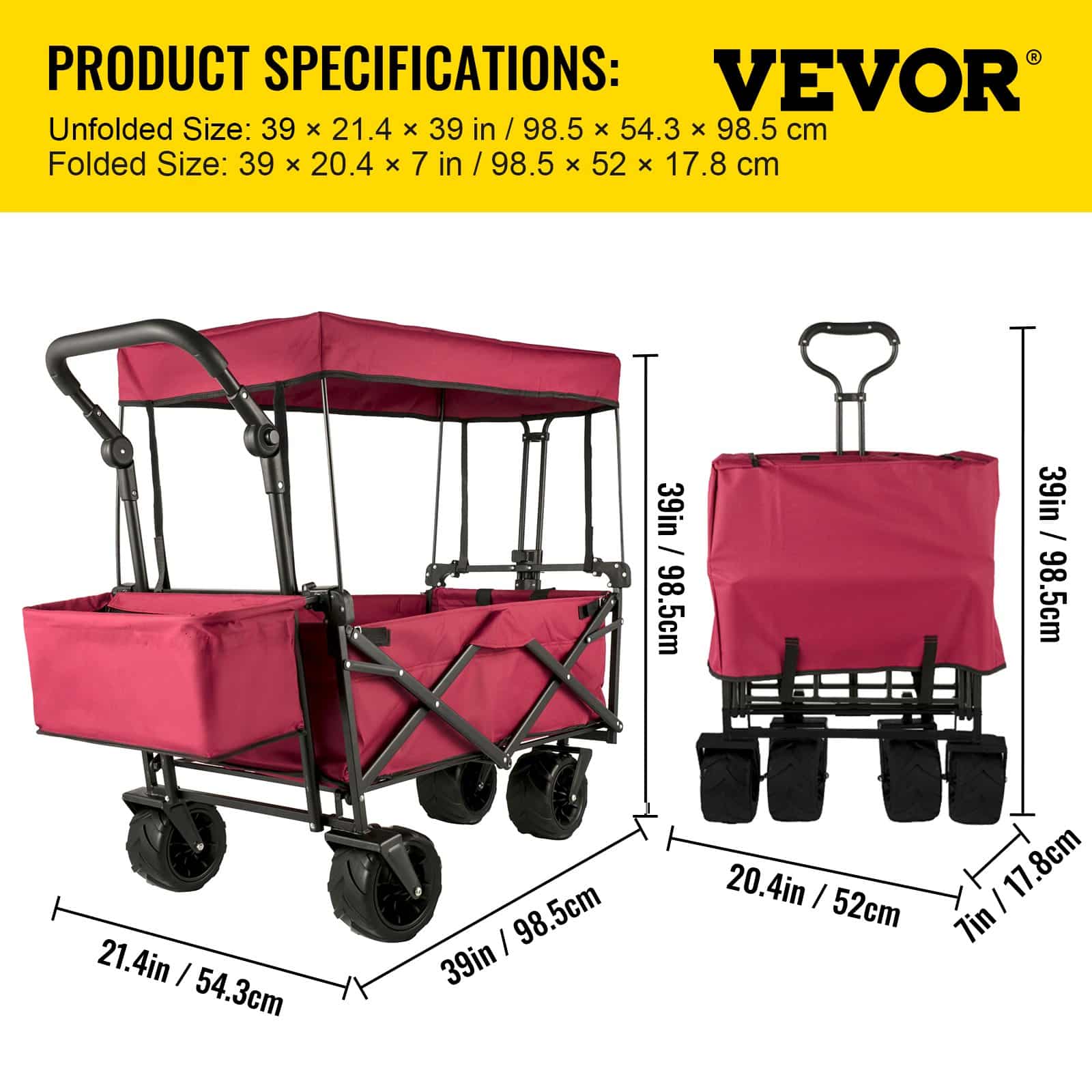 VEVOR Collapsible Wagon with Removable Canopy, 220lbs Heavy Duty Foldable Beach Wagon with Big Wheels, Folding Outdoor Utility Wagon Garden Cart with Adjustable Push Pulling Handles