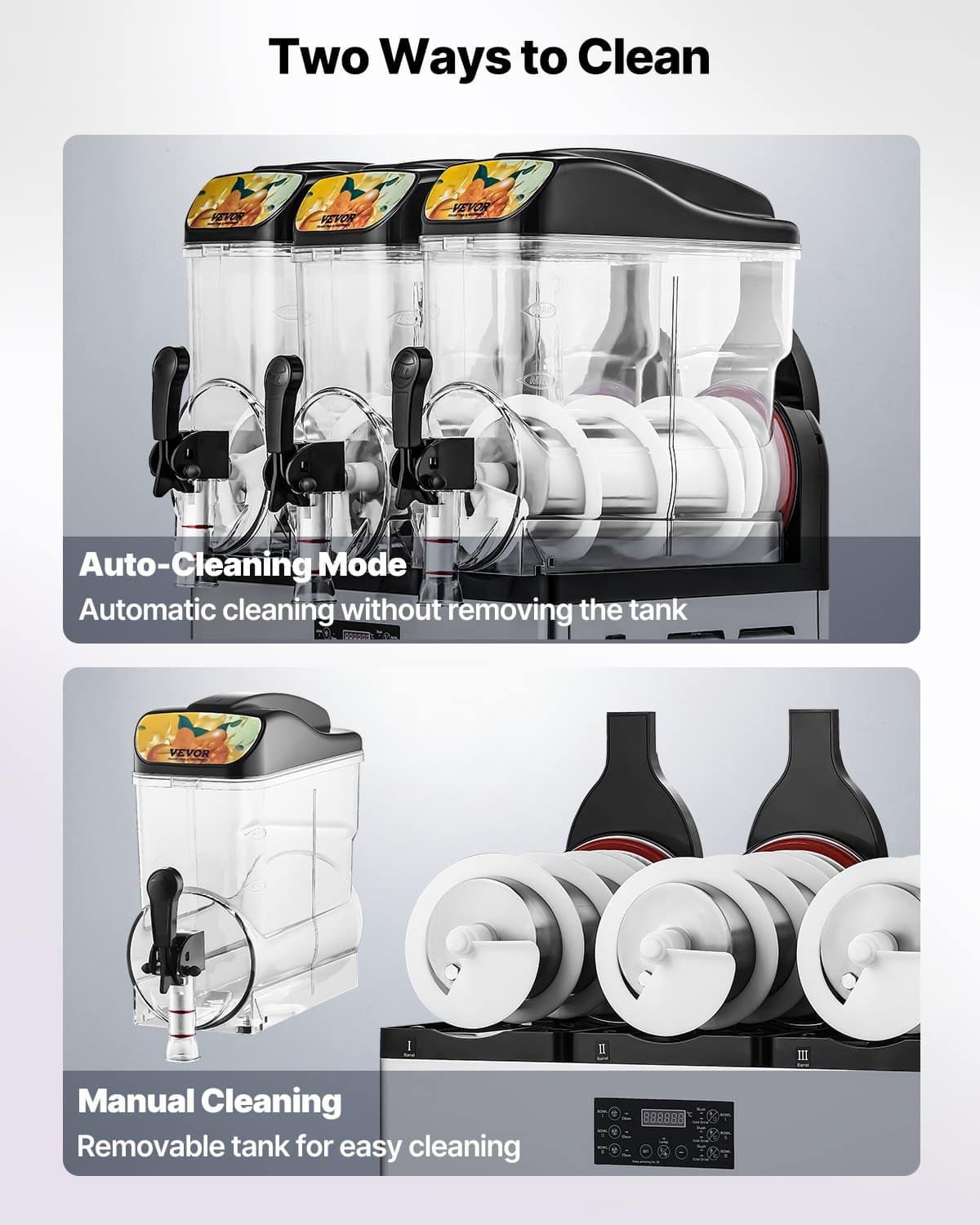 This commercial slushy machine features three 15L / 3.96 GAL capacity tanks, with a stainless steel body and PC tank, offering durable and healthy materials.