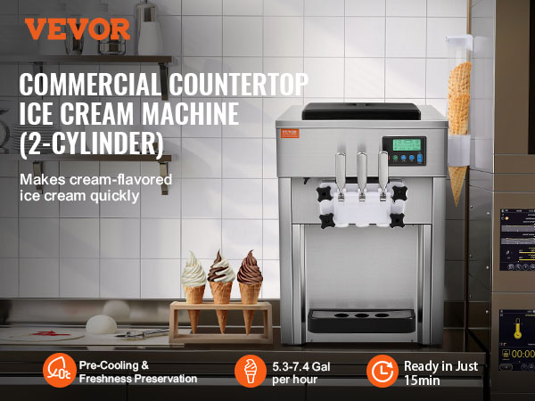 This commercial desktop ice cream maker produces ice cream in just 15 minutes. With a powerful compressor that operates quietly at less than 66 dB. It can continuously deliver 8 to 10 ice cream balls, reaching up to 20L/5.3 gal of ice cream per hour for the perfect smooth, creamy texture mix.
