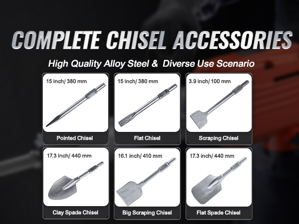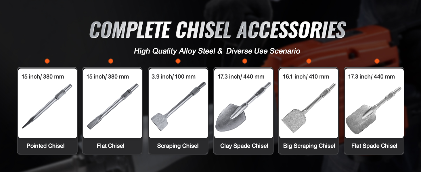 There are 6 chisels lying in the package. They are all forged from premium heat-treated alloy steel. The hexagonal chuck features quick assembly and disassembly. It is easy for you to replace the chisel that will never drop accidentally after being clamped.