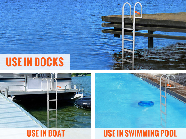 Our dock ladder features buckles design. Fix the snap ring bracket on the ground for the first time, and when the ladder is not in use, just pull the buckles out of the snap ring rack.