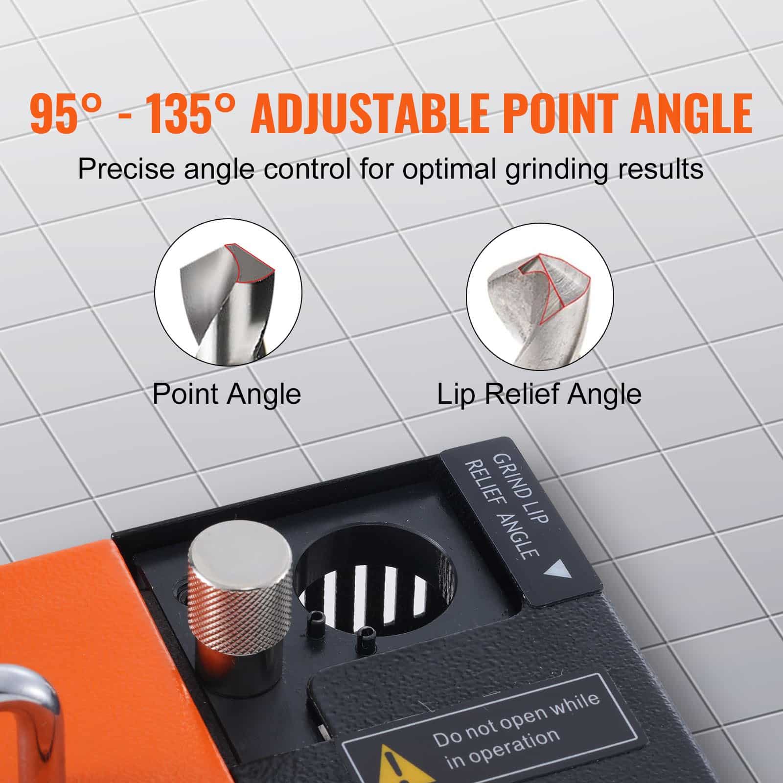 Precision Grinding Made Easy! Our drill bit sharpener allows for precise sharpening of point and lip relief angle. And the point angle can be adjusted from 95° to 135°, which can effectively coordinate with the material of drill hole and the rotation speed.
