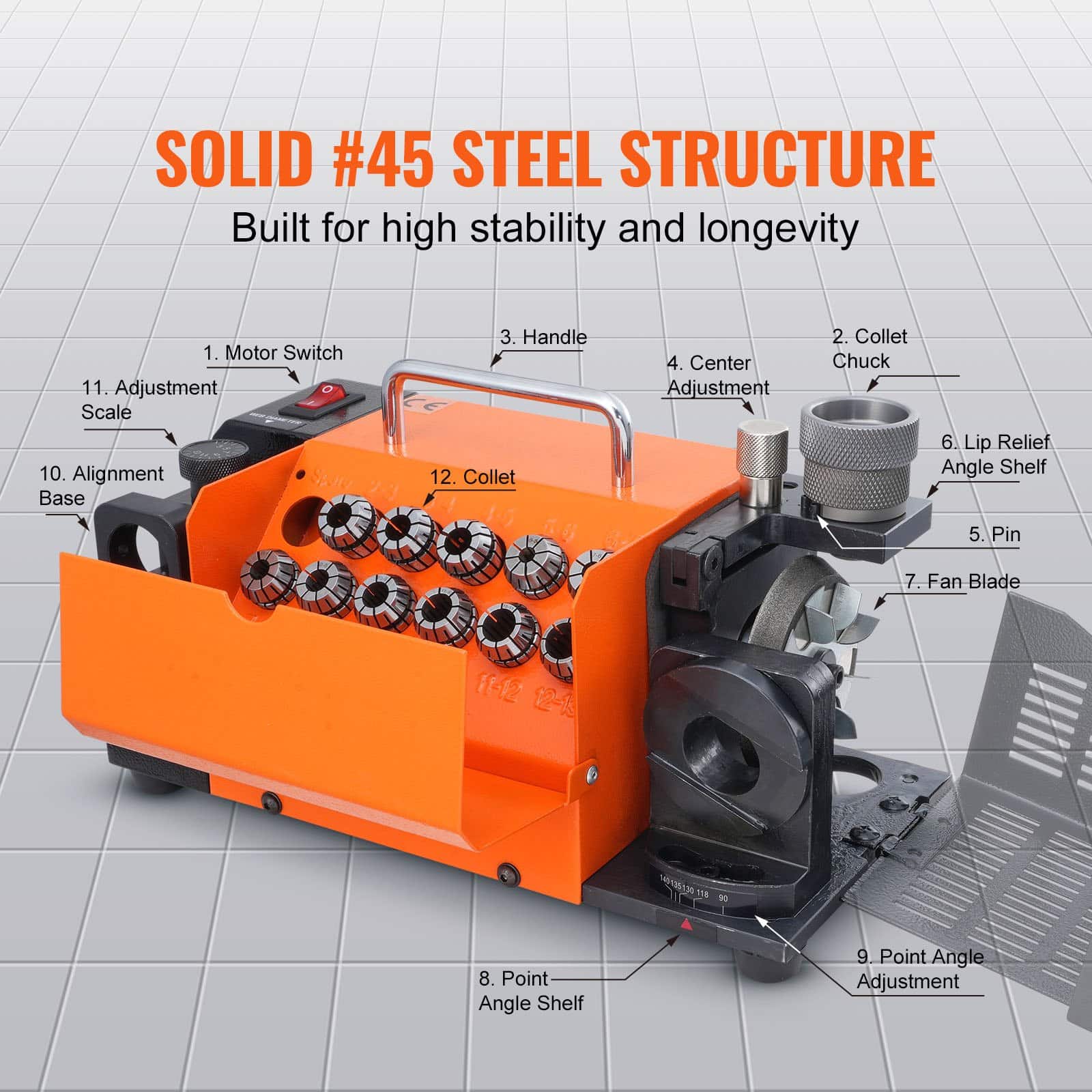 Experience precision and efficiency with VEVOR drill bits sharpener! With 95° to 135° adjustable point angles and 11 collects, it ensures accurate and stable sharpening for drill bits of ф3-ф13 diameters. Choose between CBN and SDC grinding wheels for different materials to optimize efficiency.
