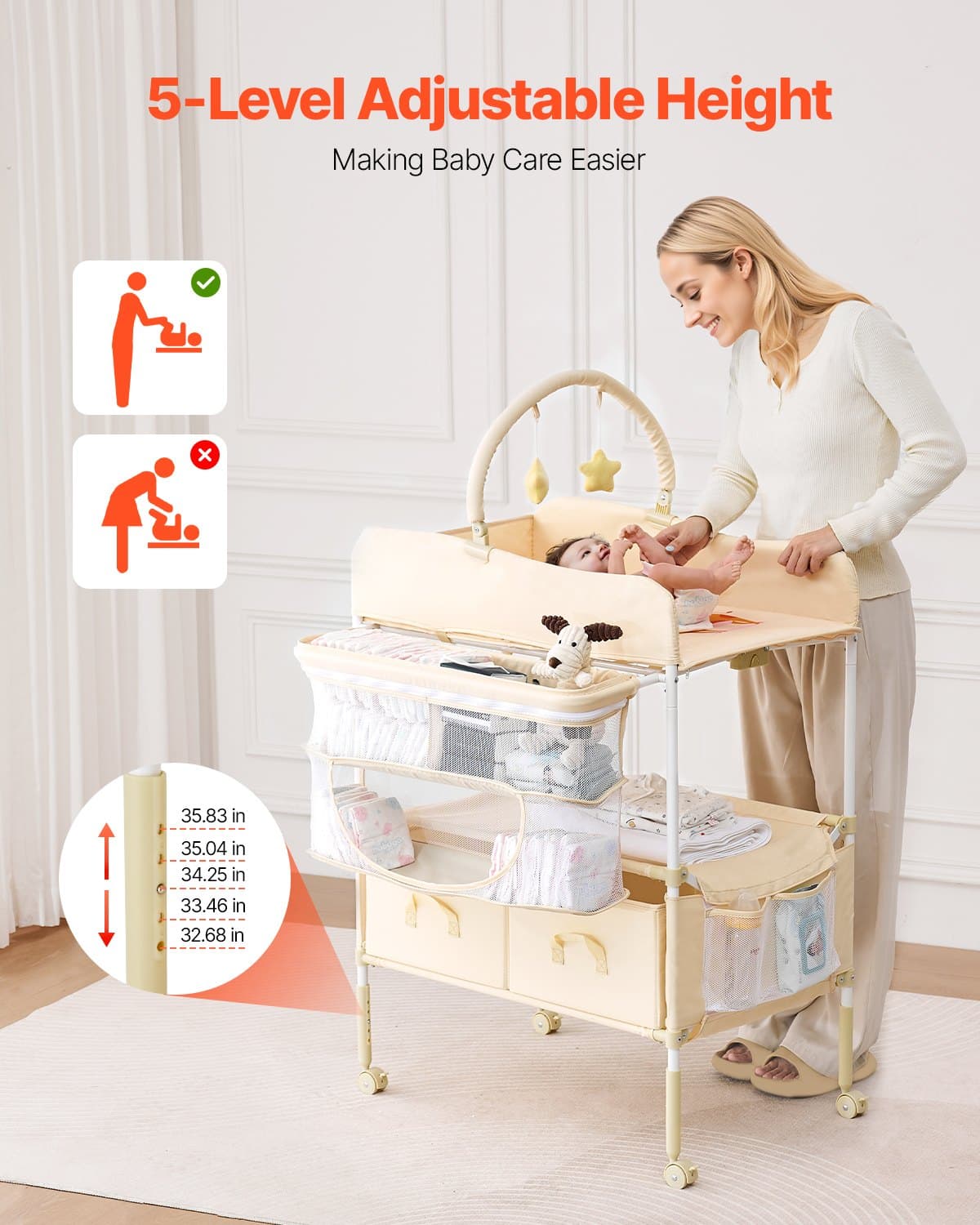VEVOR Baby Changing Table, Foldable Diaper Change Station with 2 Fabric Drawers, Side Basket & Hanging Rod, Adjustable Height Portable Changing Table with Lockable Wheels & 2 Star Toys, Light Beige