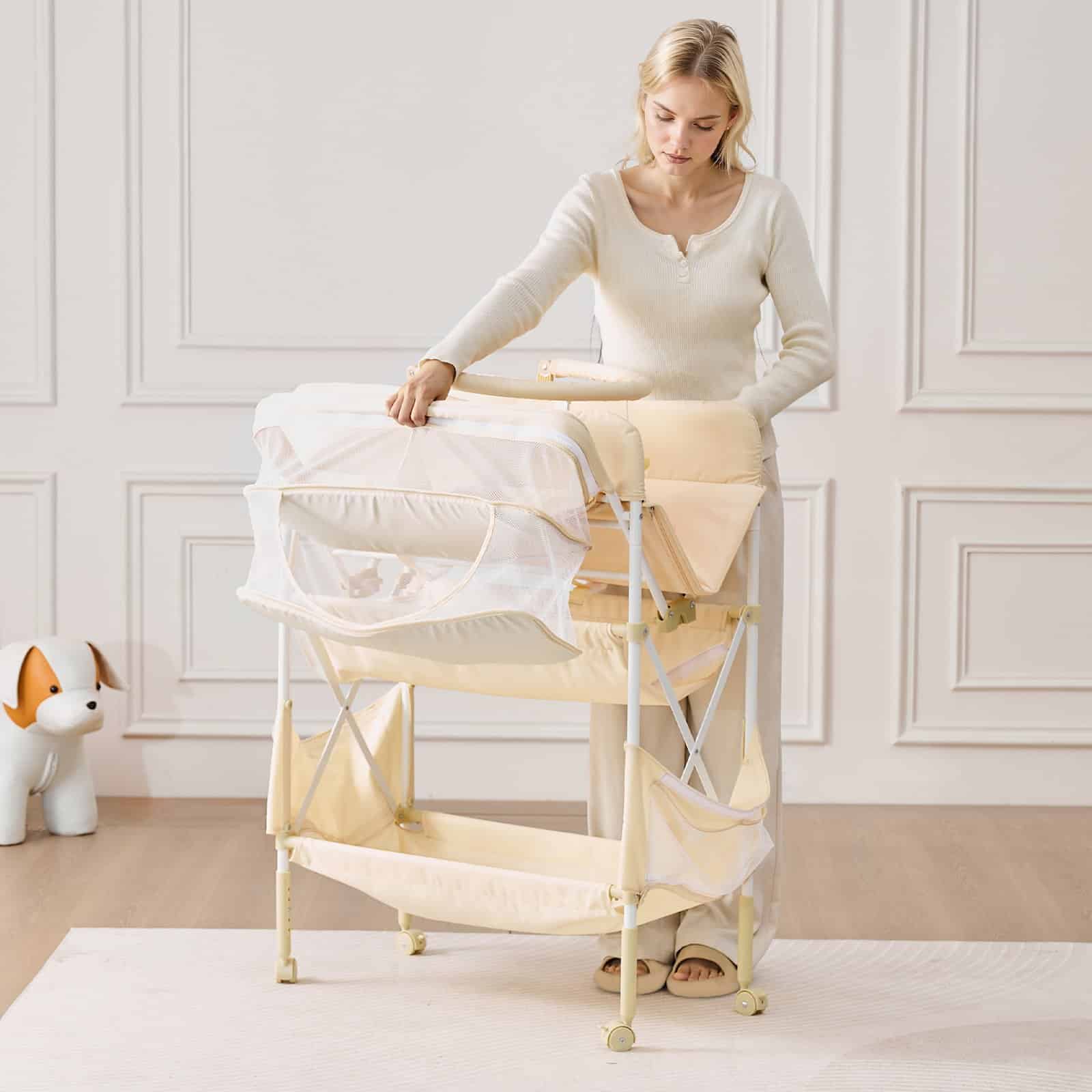 Equipped with a quick-fold design and four lockable, silent swivel wheels, this baby changing table is easy to store and transport. Whether at home or traveling, it provides full protection for your baby, ensuring peace of mind wherever you go.