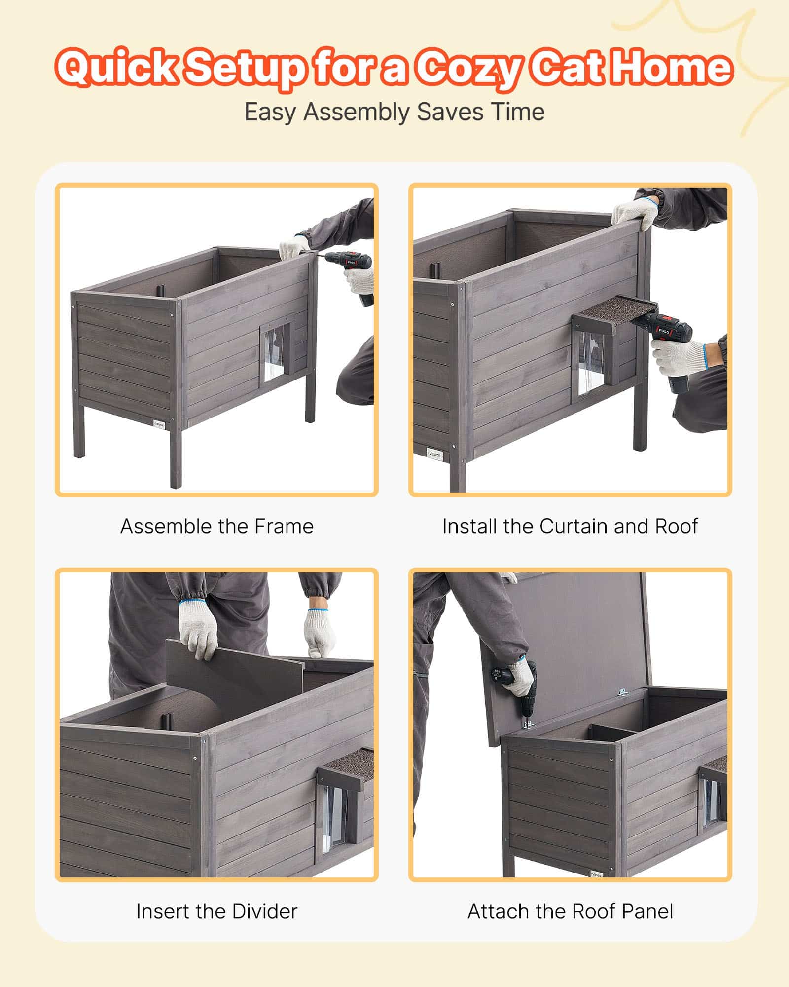 This elevated cat house is ideal for outdoor spaces like lawns, gardens, patios, or indoors as a private cat corner. It is a great cat home for both indoor pet and outdoor use for stray cats.