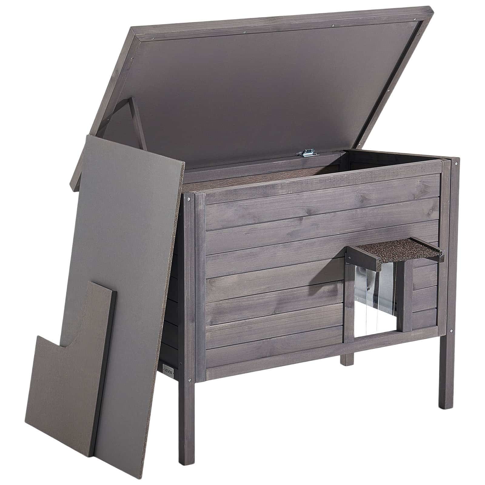 Our outdoor cat shelter with hinged roof for quick access; removable floor and panels can be washed, making maintenance simple and hygienic.