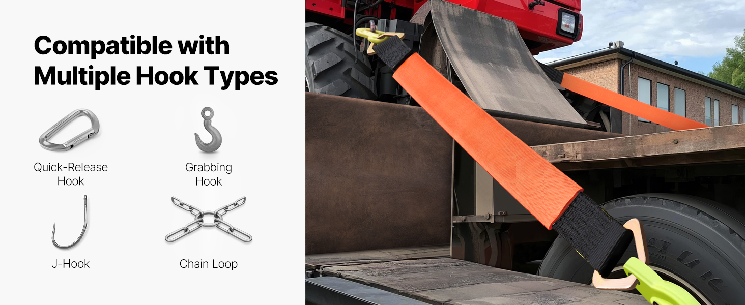 With our heavy duty tie down axle straps, you can quickly wrap them around your vehicle or item and connect them using hooks compatible with various hook shapes. The quick installation improves efficiency.