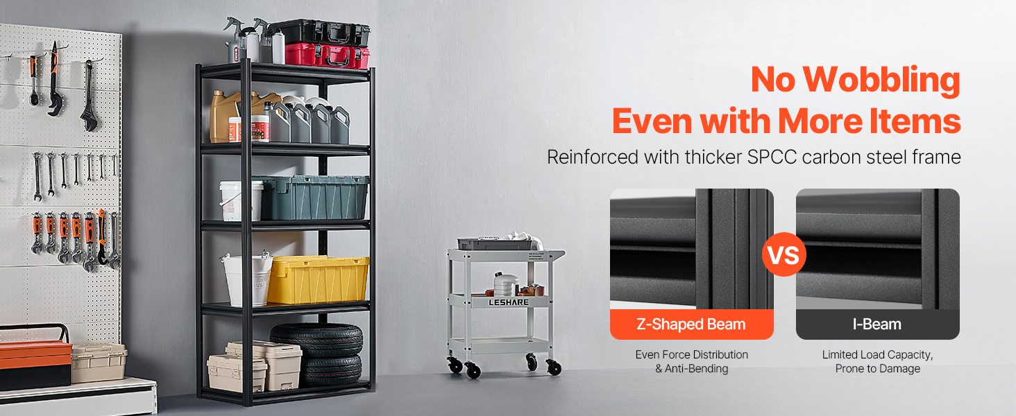 Our garage shelving is crafted from high-quality SPCC carbon steel with a powder-coated finish. It provides excellent rust and scratch resistance, ensuring long-lasting durability and aesthetic appeal.