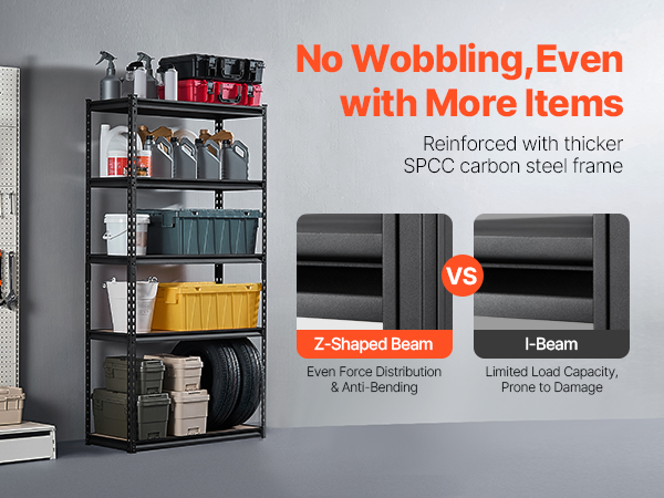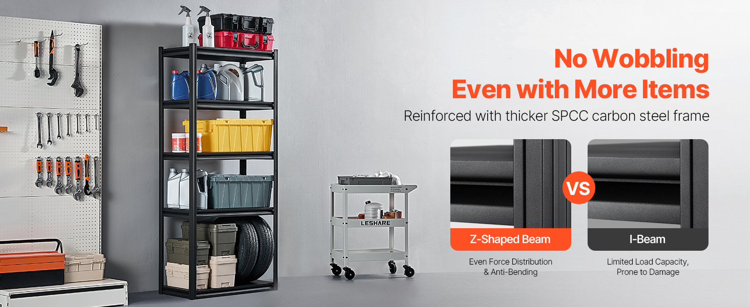 Our garage shelving is crafted from high-quality SPCC carbon steel with a powder-coated finish. It provides excellent rust and scratch resistance, ensuring long-lasting durability and aesthetic appeal.
