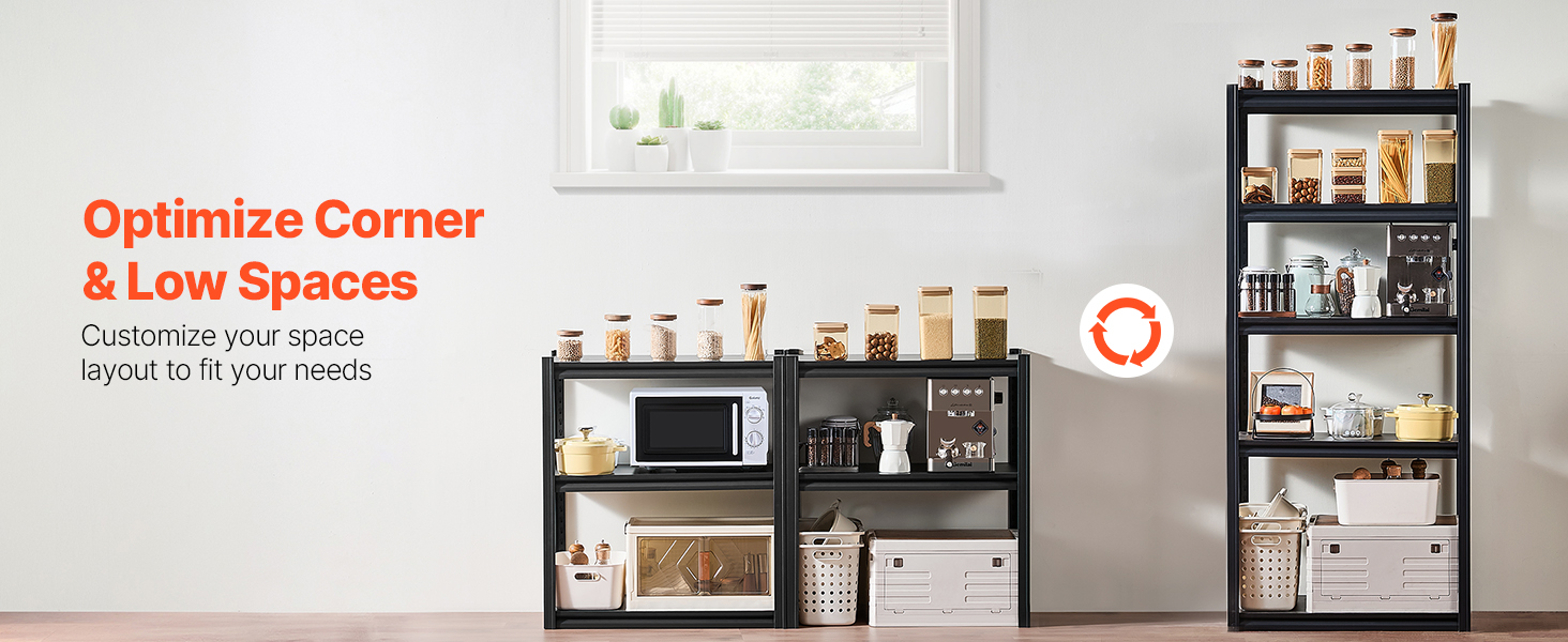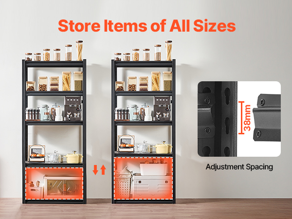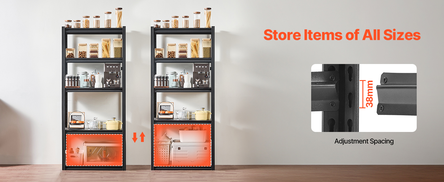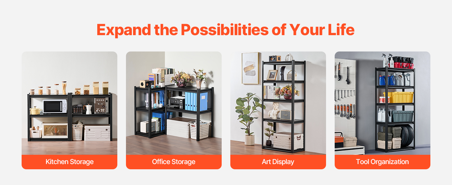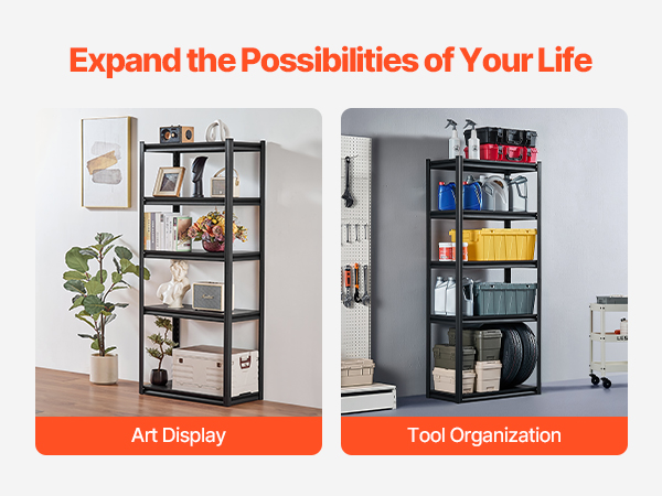 This storage shelving unit is a 2000 lbs weight capacity powerhouse, easily handling all your storage needs. Whether it's tools or miscellaneous items, everything stays organized and tidy.