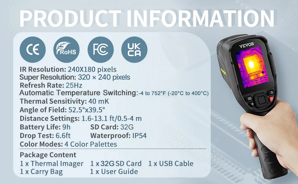 Boasting an impressive 320 x 240 super resolution, VEVOR SC240 delivers crystal clear images to identify problematic areas in various situations, so that you don't miss out a thing on essential details. It stands out with a lithium-ion battery lasting over 9 hours and 32G storage room for >90,000 images. Get this perfect thermal camera for home inspection, HVAC check, plumbing, and more. Explore the world in a new way with VEVOR!