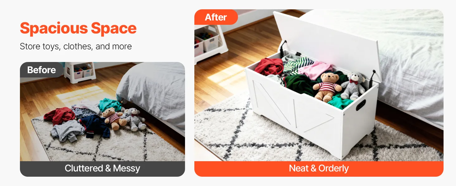 • Reliable & Scratch-Resistant: Our wooden toy chest features MDF and a melamine surface, a pinch-resistant design, meeting home standards. It delivers two slow-closing rods and round edges to avoid scratches and bumps, making parents feel reliable