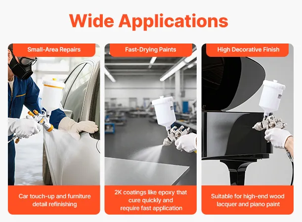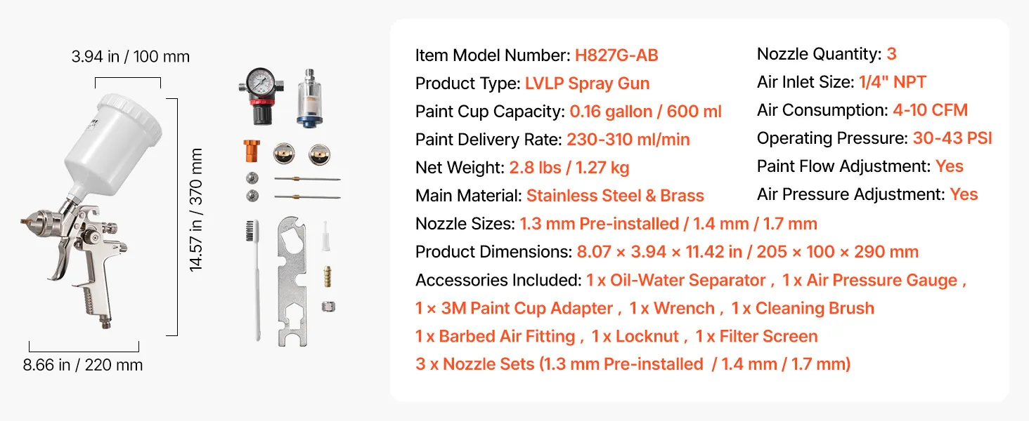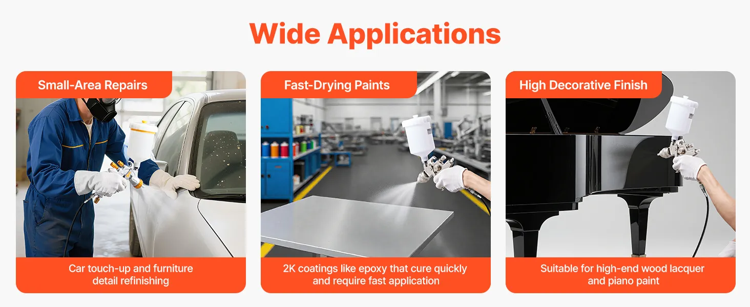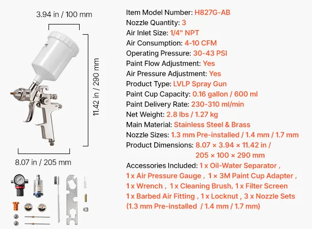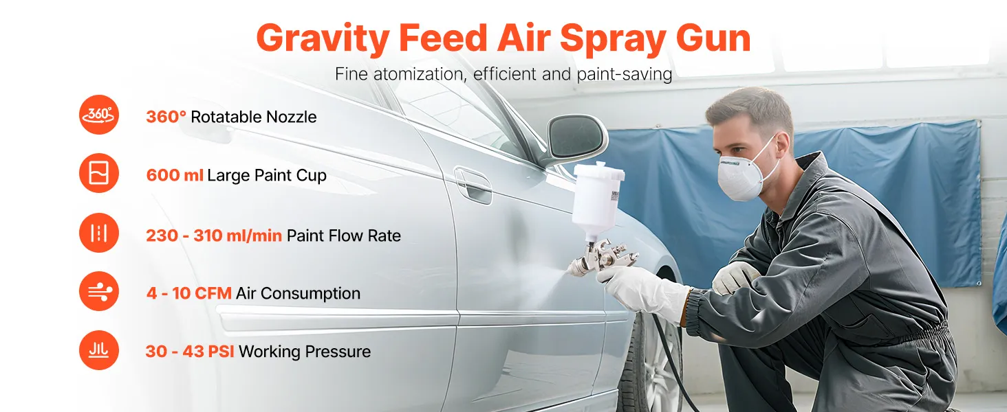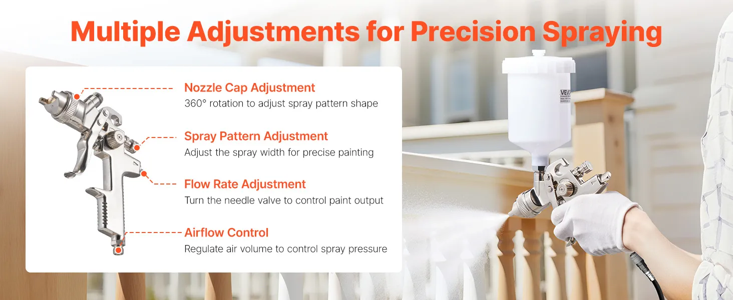 Are you tired of experiencing paint leakages and uneven spraying? Say goodbye to those problems with the help of VEVOR LVLP air spray gun! Our gravity feed paint sprayer features 3 nozzles, adjustable paint flow, fine atomization, uniform spray, and paint-saving efficiency.