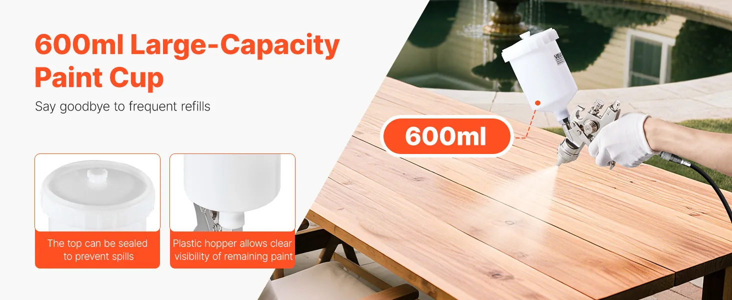 600 mL (20 oz) large-capacity paint cup reduces the need for frequent refills and allows longer, uninterrupted spraying for smoother, steadier, more efficient results.