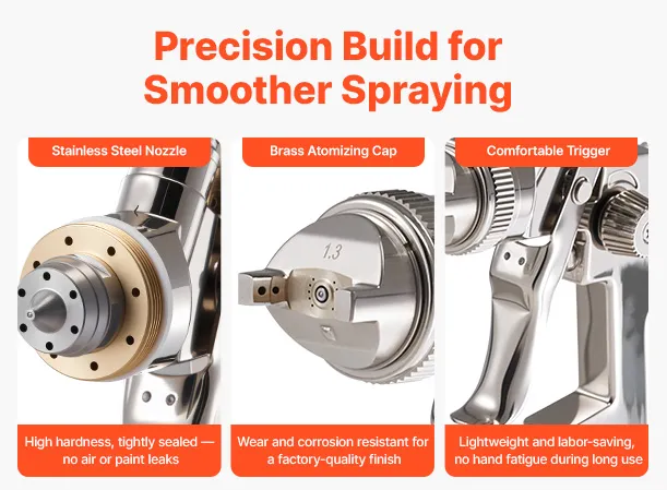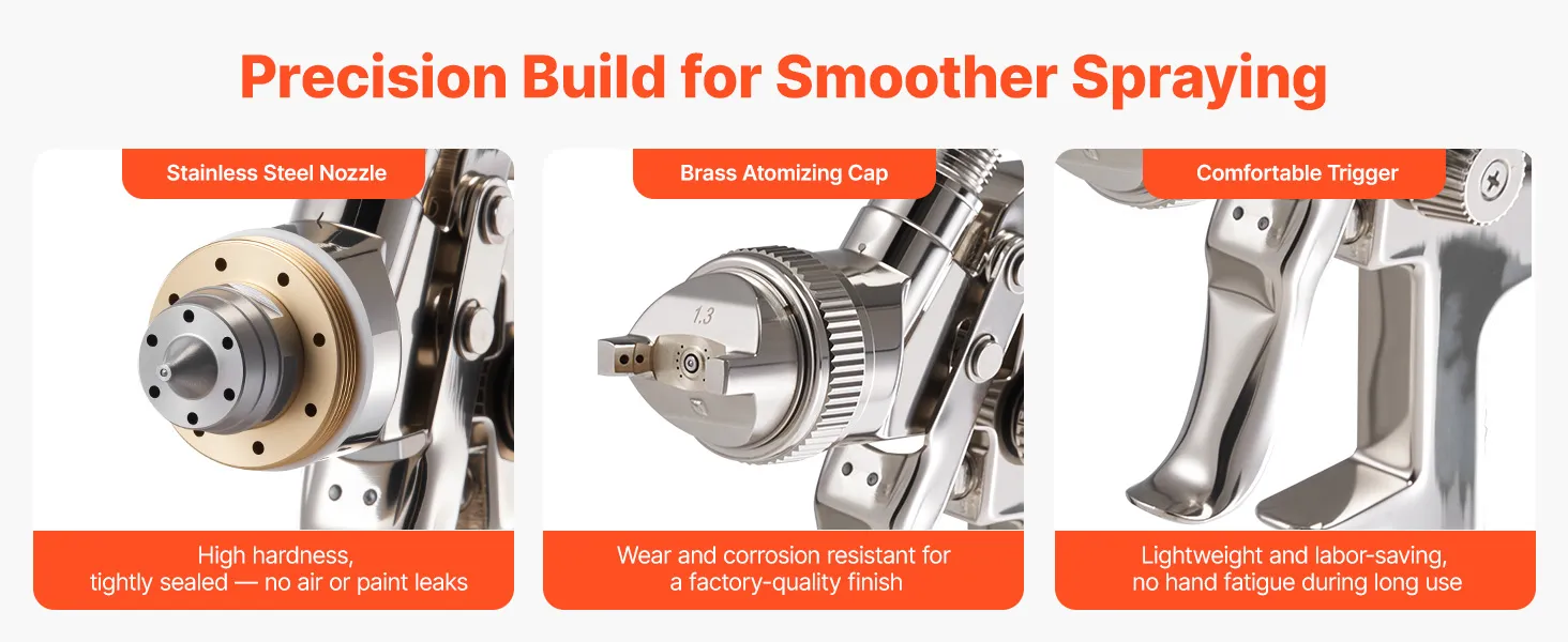The durable stainless steel nozzles and brass atomizing cap help prevent air and paint leaks, Responsive trigger and ergonomic grip reduce hand fatigue and ensure more precise spray control.