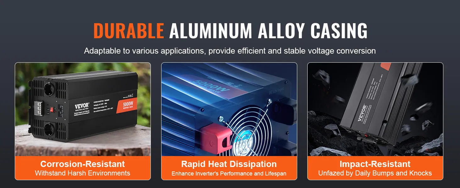 Elevate your power experience with our sleek, robust power inverter encased in premium aluminum alloy. Not only does it stand up to corrosion and oxidation, but it also excels in dissipating heat efficiently, ensuring your energy flows smoothly and reliably.