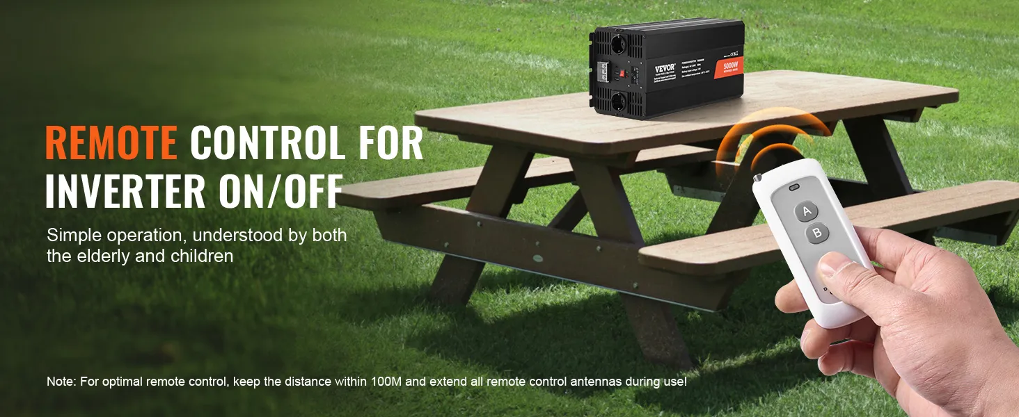 With our power inverter's remote control feature, convenience is just a click away. Even if your inverter is installed in hard-to-reach places, our remote control allows you to power on and off within a 100-meter range effortlessly. Enjoy the freedom of controlling your inverter from afar!