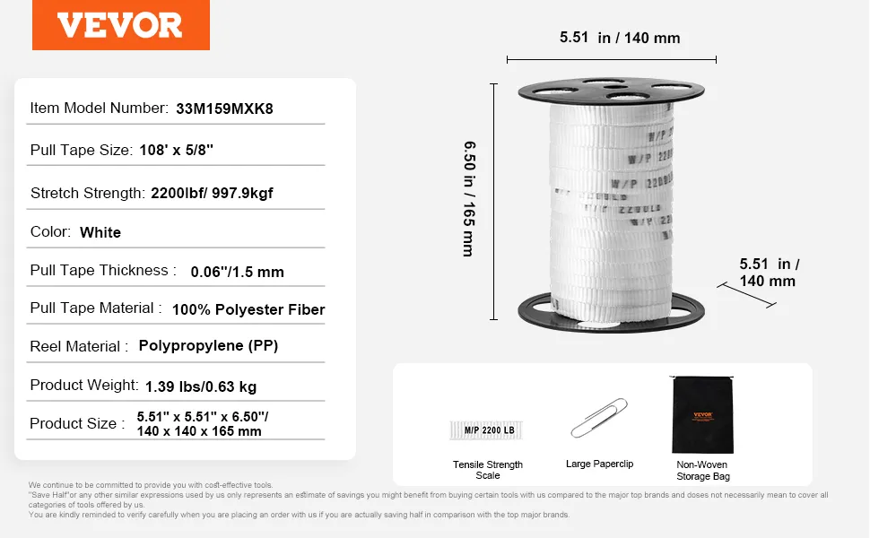 We've got you covered for convenience! VEVOR polyester pull tape comes with a non-woven storage bag for easy organization of used tapes and a large paperclip-style fastener to keep unused tapes secure and accessible.