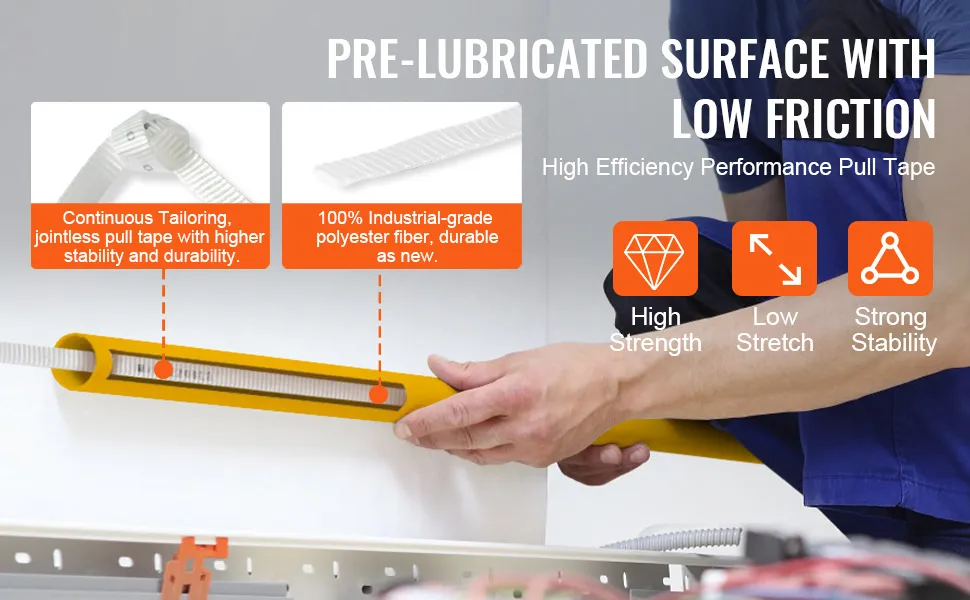 Say goodbye to mid-operation breakage! Our pre-lubricated pull tape glides through pipes with ease, solving the common issue of friction. It's perfect for long-distance pulls, and its seamless design adds reliability to any wiring job.