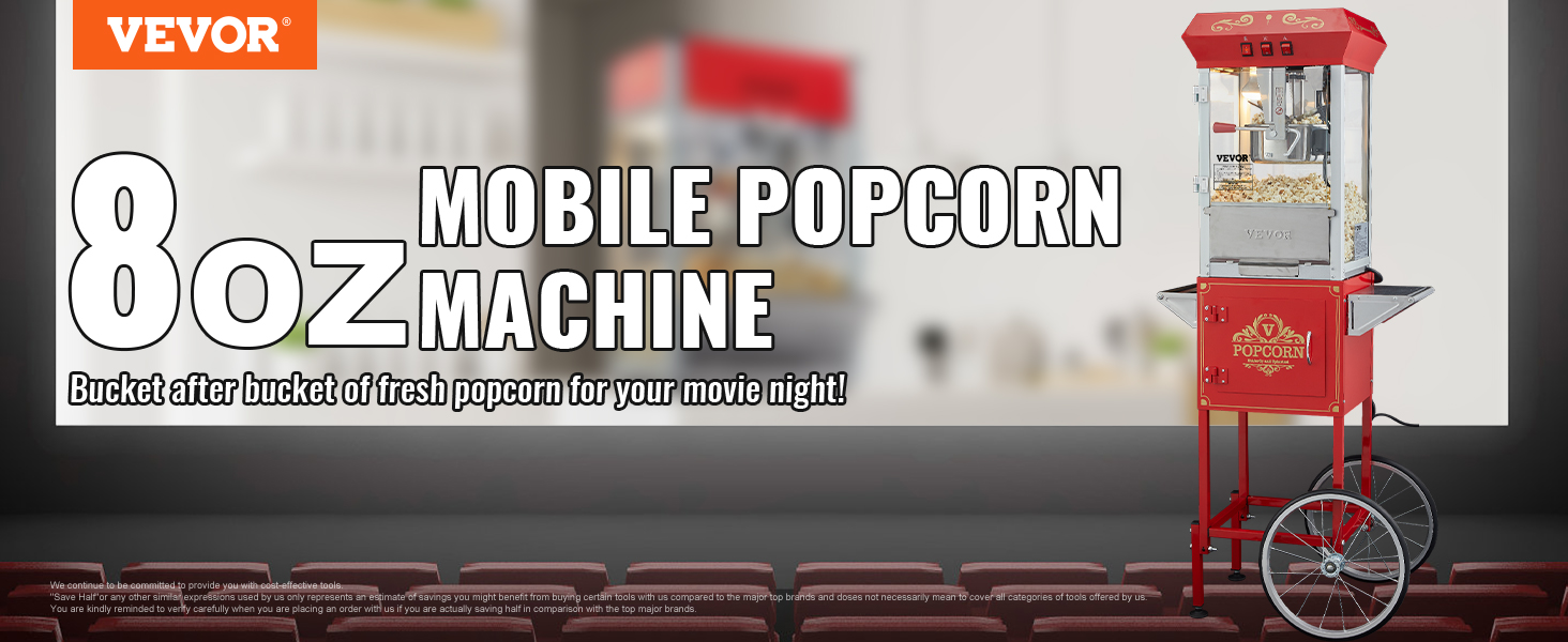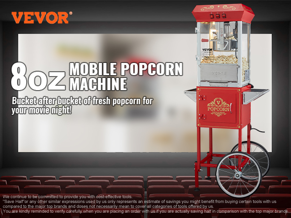 VEVOR Commercial Popcorn Machine with Cart, 850W, 8 oz (227g) Kettle, 48-Cup Capacity, Red Theater Style Popcorn Maker