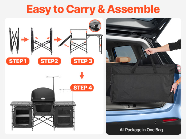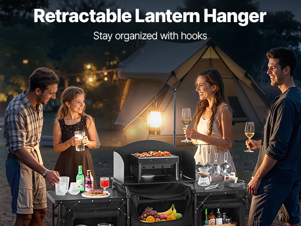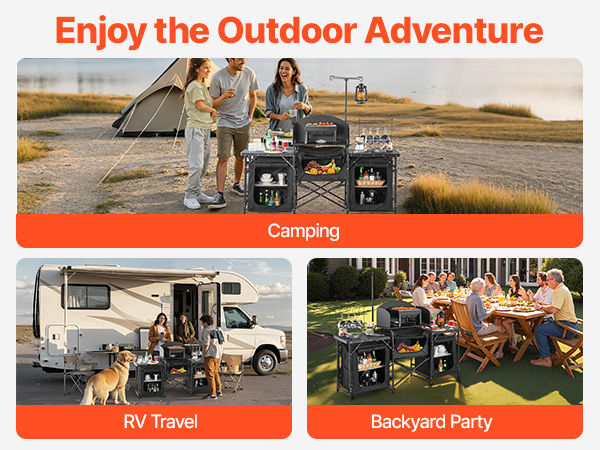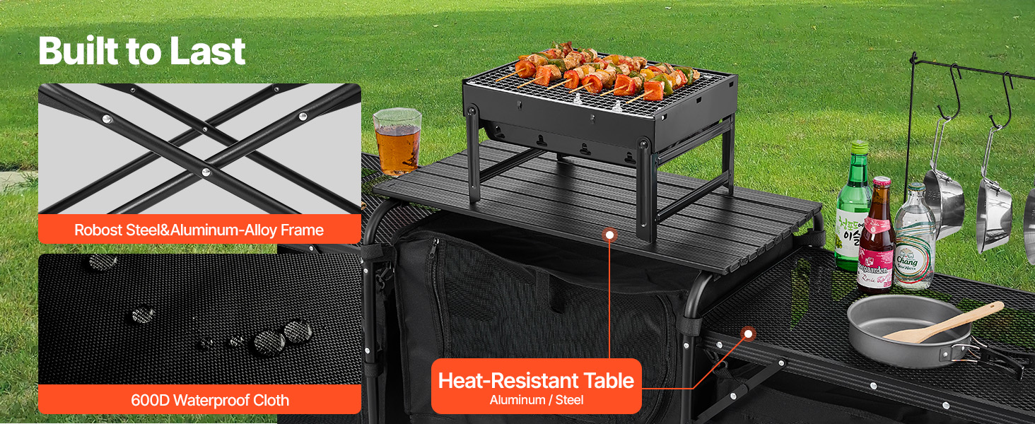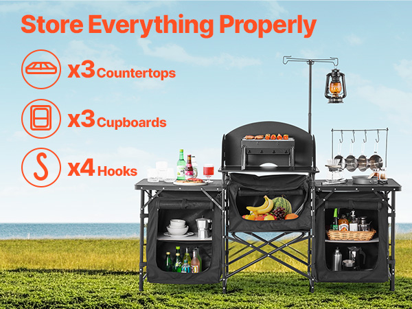 The camping kitchen station features an X-frame that enhances stability for loading heavy cookware, such as camp stoves, portable gas stoves, grills, etc. You won’t worry about its rollover.