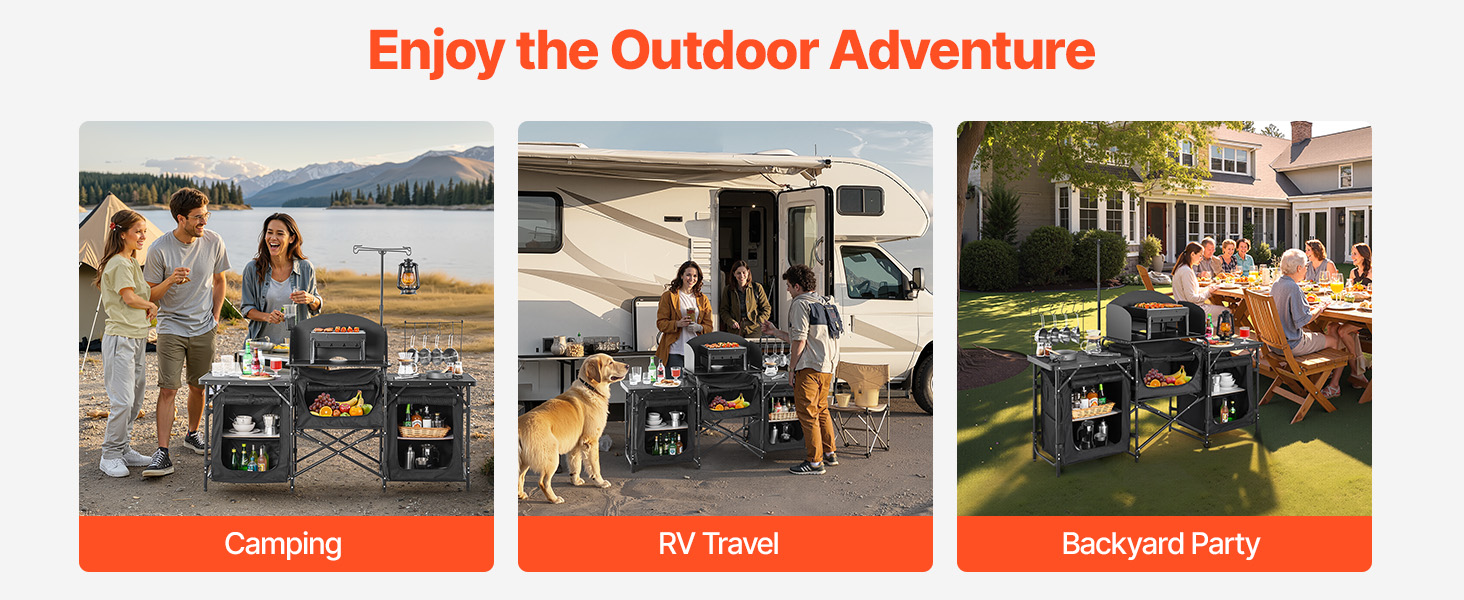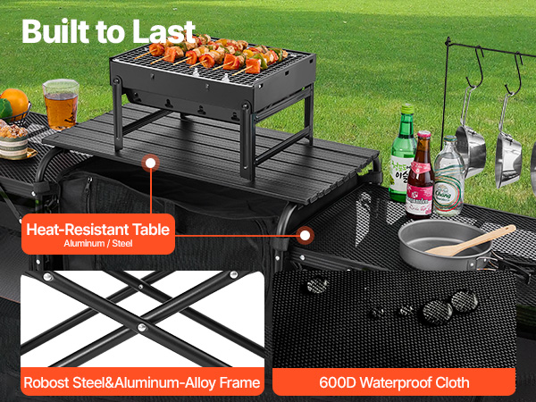 The camping kitchen table greatly extends your storage space, allowing you to carry as many ingredients and kitchen utensils as possible. It also features hassle-free cleaning.