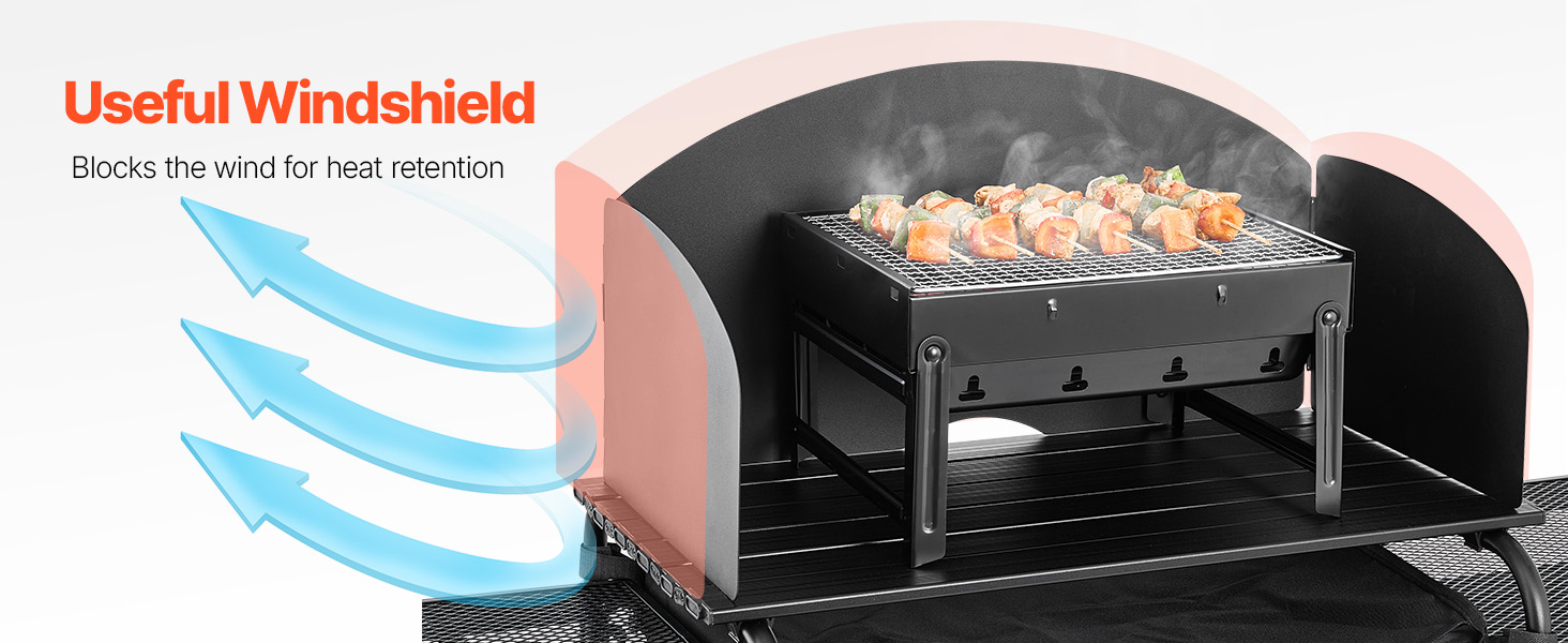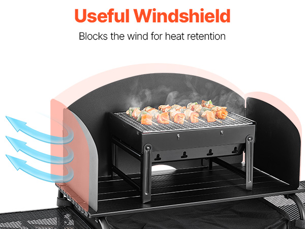 The windscreens on three sides of the upper table top block the wind and ensure more effective burning. They can be removed for a wider table top.