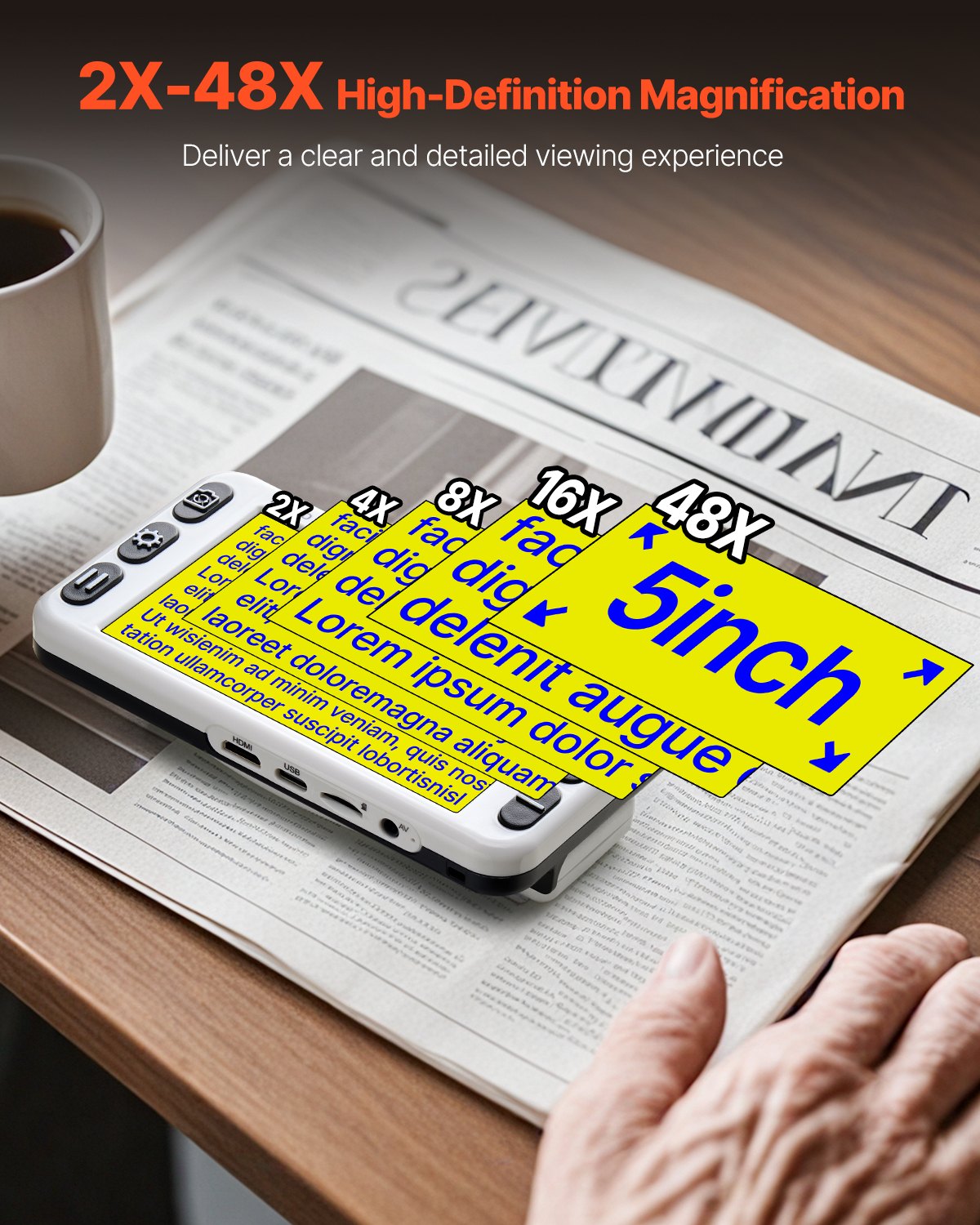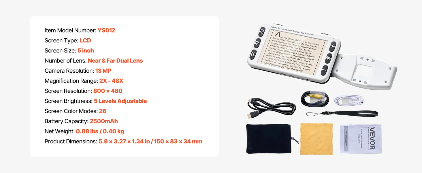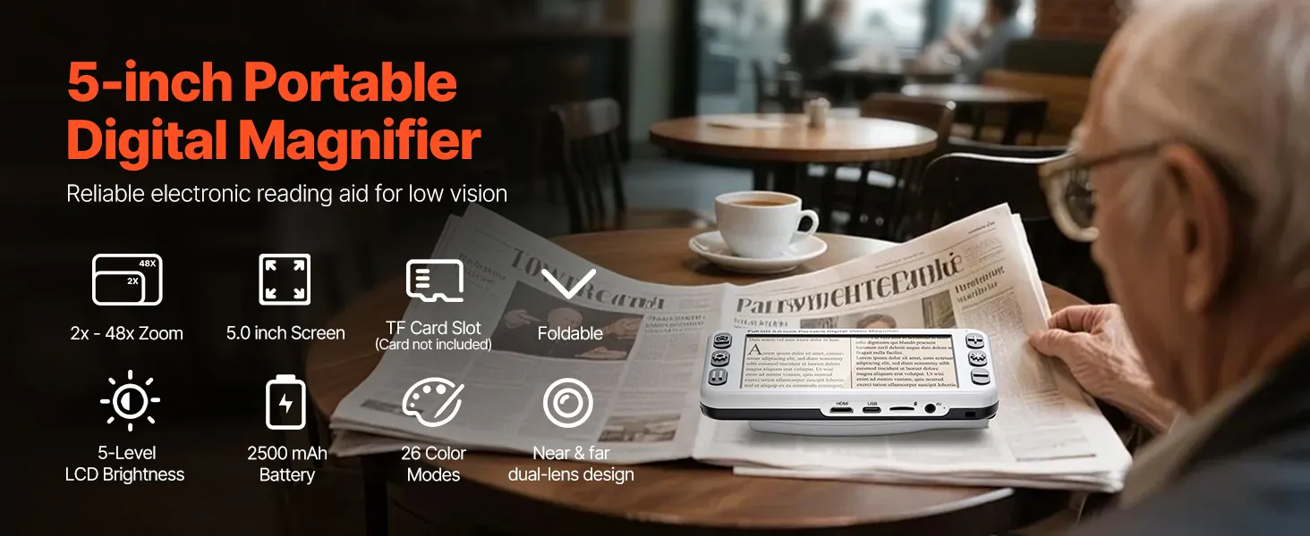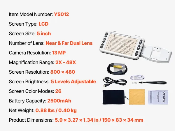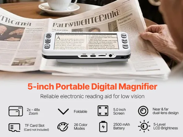 Featuring a 5.0-inch HD LCD screen, 13MP near and far dual lens, 26 color modes, 2X to 48X high-definition magnification, AV & HDMI dual outputs, and 2500mAh rechargeable battery, this portable digital magnifier offers comprehensive visual aid for those with low vision in reading and image viewing.