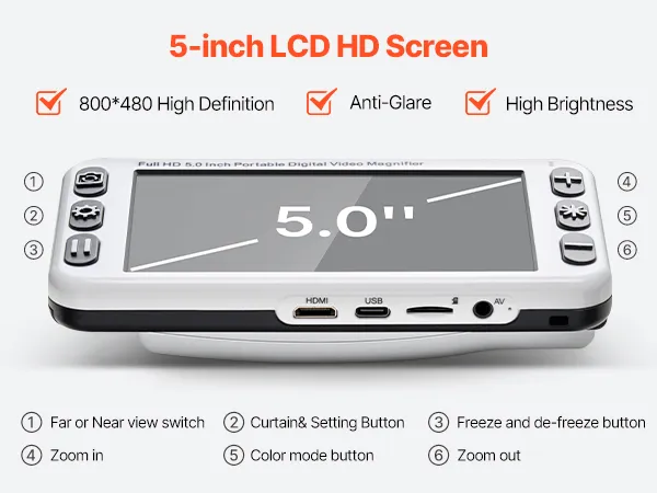 This digital magnifier for low vision features a 5-inch LCD screen with 800 x 480 high-definition resolution. It provides clear images, anti-glare display and comfortable viewing experience, ideal for those with low vision for daily reading or image viewing.