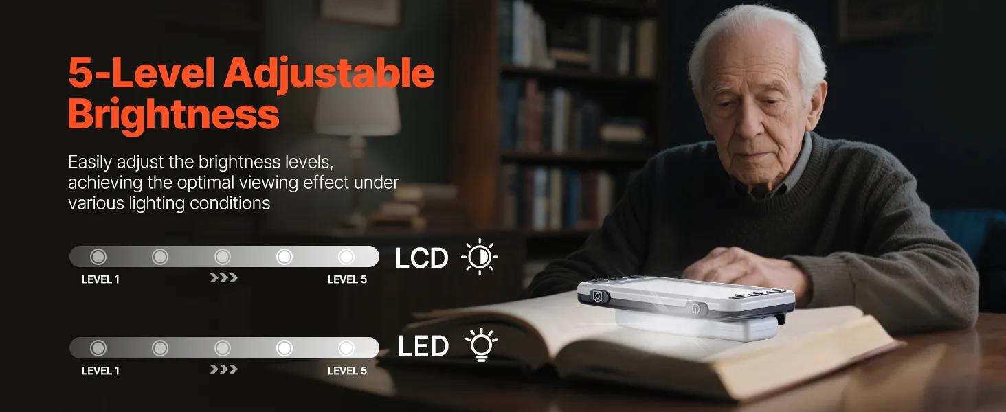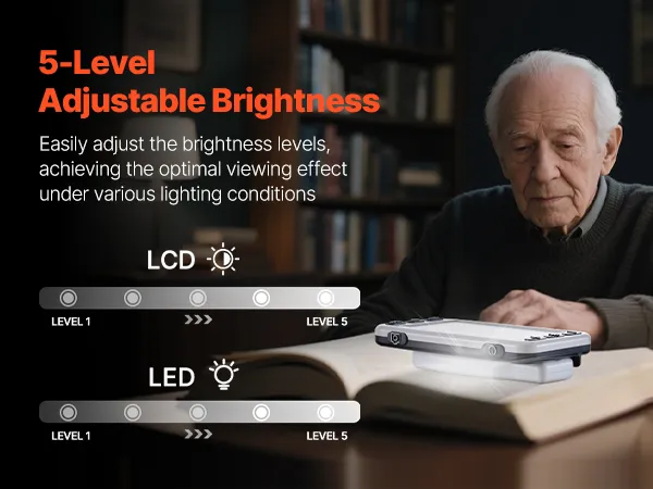 Featuring 5-level LCD screen brightness and adjustable LED lighting, this portable digital video magnifier delivers optimal viewing effect under various lighting conditions—reducing eye strain and helping protect your eyesight.