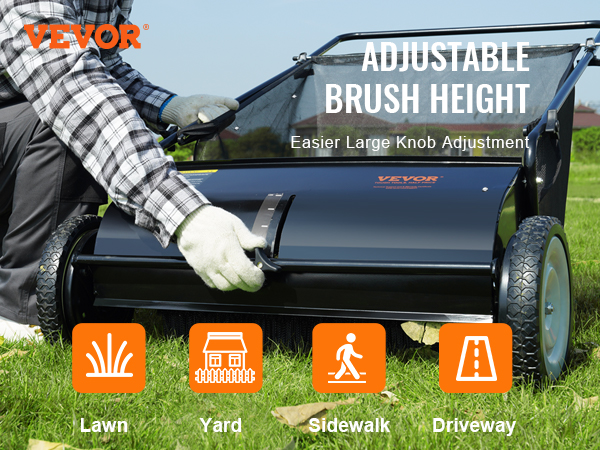• Adjust to Any Terrain: The lawn sweep is designed with an adjustable spinning brush height–simply adjust the knob by hand to move brushes up and down without the need for any special tools. You can use it on any terrain, whether it’s a sidewalk, driveway, yard, or garden.