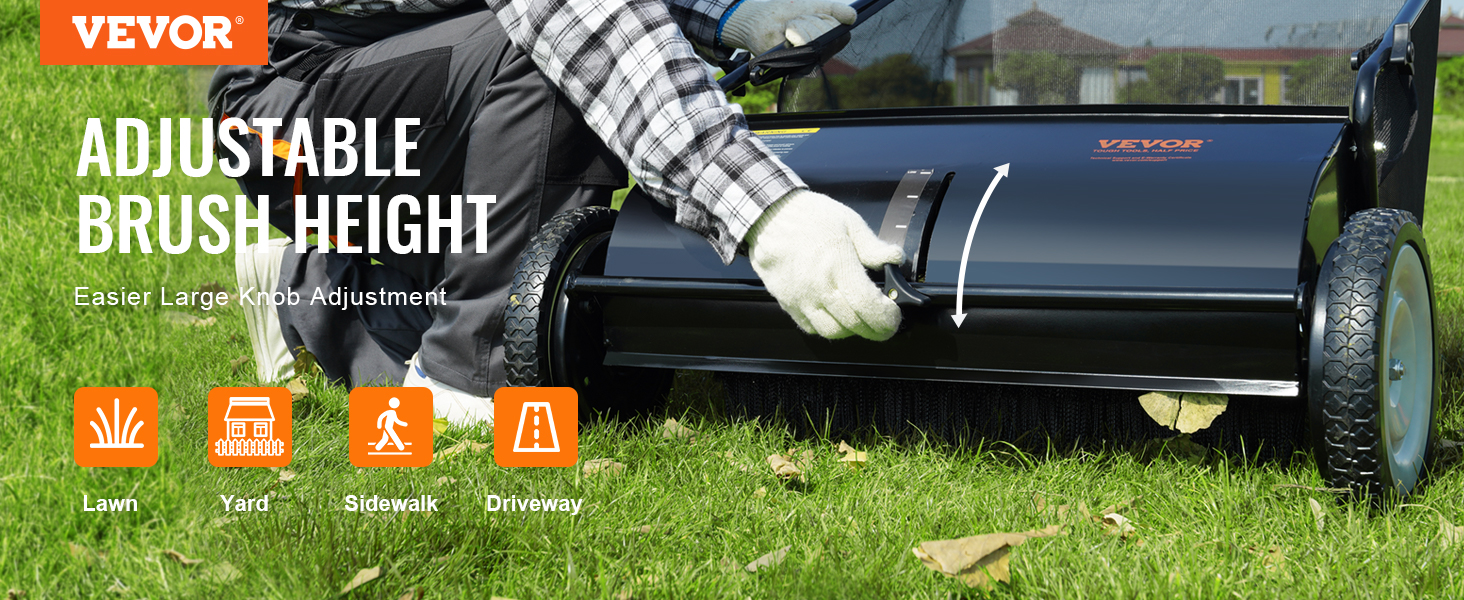 • Effortless Cleaning: Just grab the ergonomic handle, push your yard leaf sweeper from behind, and watch the powerful spinning brushes scoop up everything in their path! It quickly picks up leaves, small twigs, grass clippings, and other dry debris, cleaning your entire lawn with fantastic speed.