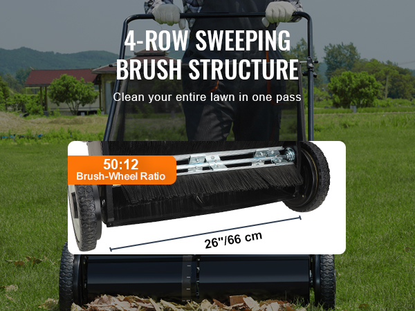 • Keep Your Lawn Spotless: Unlike most lawn sweepers, our lawn sweeper has thickened and densified four brushes to increase the overall sweeping force and prevent deformation. With a sweeping width of 26″/66 cm, it can pick up 80% of the debris in one pass.