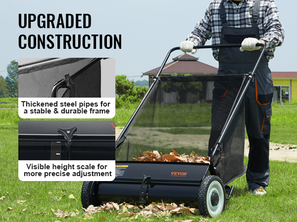 • Heavy-Duty Construction: Our hand push lawn sweeper is built to last with reinforced steel pipes, providing a stable and sturdy frame that won’t tip over even when the hopper bag is full. Plus, we’ve added a height scale guide next to the knob for easy adjustment before cleaning.