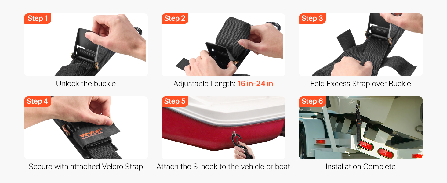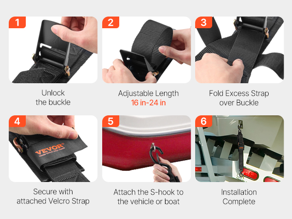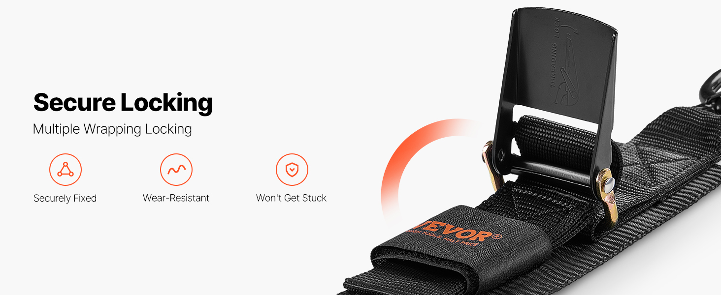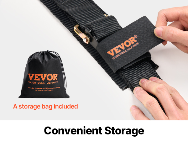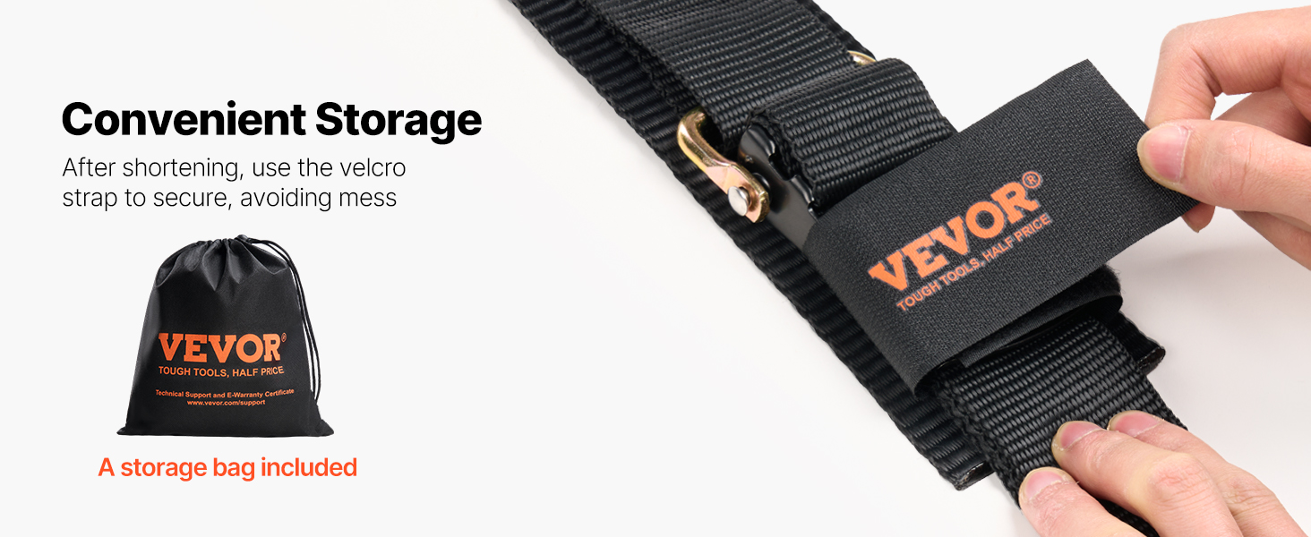 The ratchet tie-down strap locks securely with a winding design, avoiding unhooking. It's easy to install and comes with a storage bag for convenient storage.